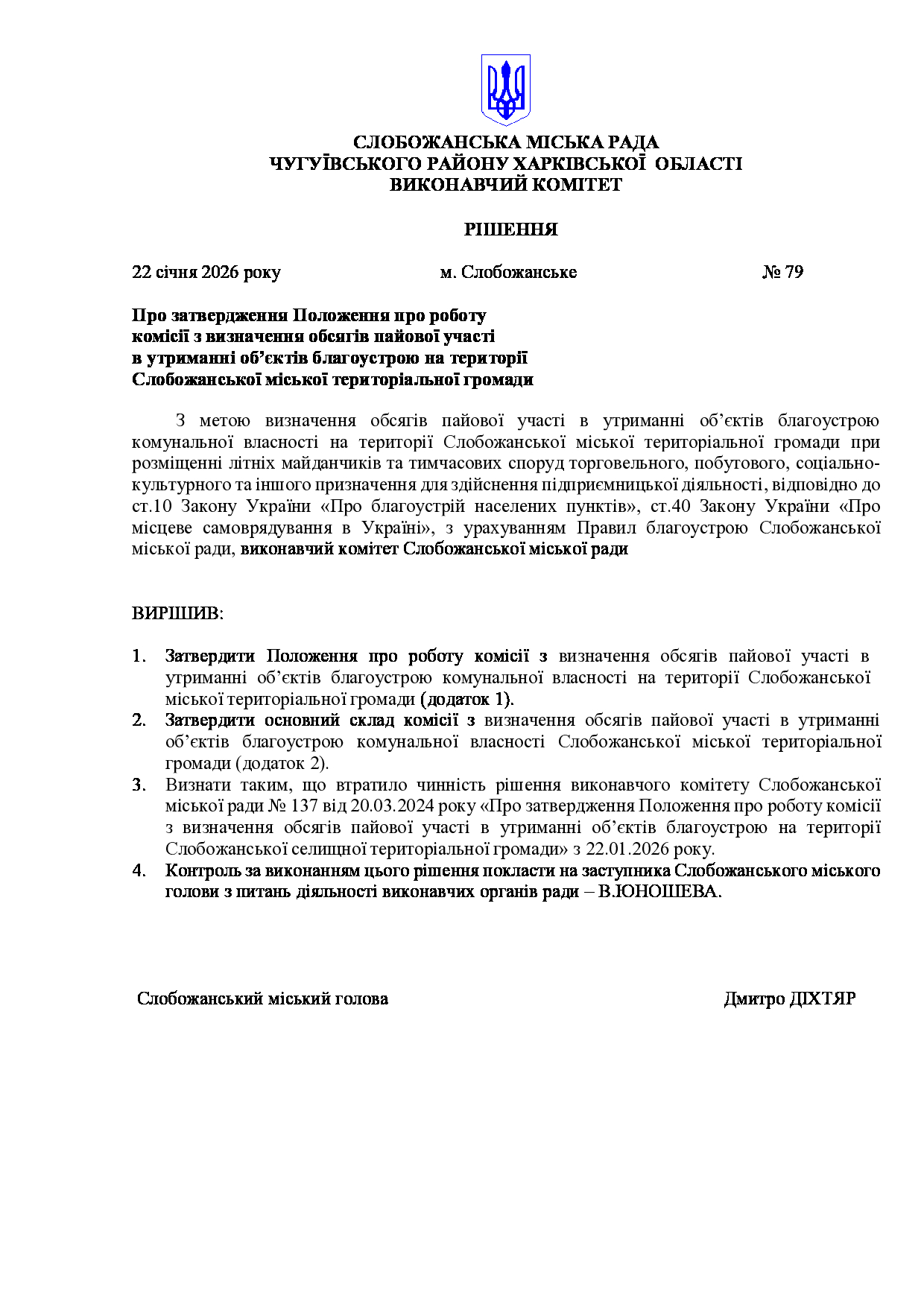Рішення виконавчого комітету №79 Про затвердження Положення про роботу комісії з визначення обсягів пайової участі в утриманні об’єктів благоустрою на території Слобожанської міської територіальної громади.