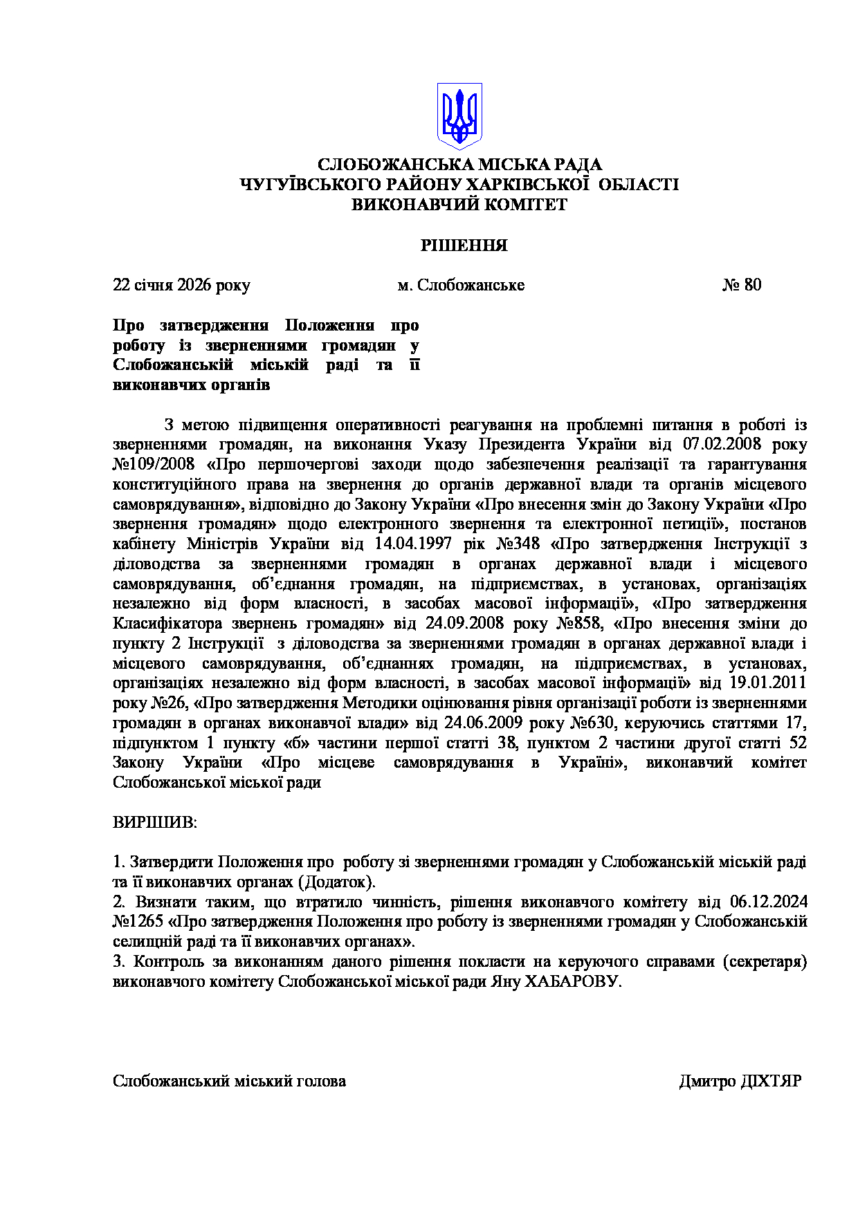 Рішення виконавчого комітету №80 Про затвердження Положення про роботу із зверненнями громадян у Слобожанській міській раді та її виконавчих органів.