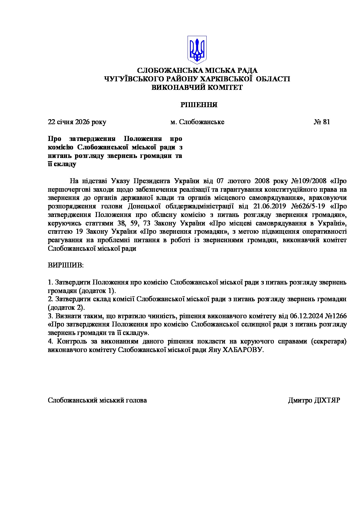 Рішення виконавчого комітету №81 Про затвердження Положення про комісію Слобожанської міської ради з питань розгляду звернень громадян та її складу.