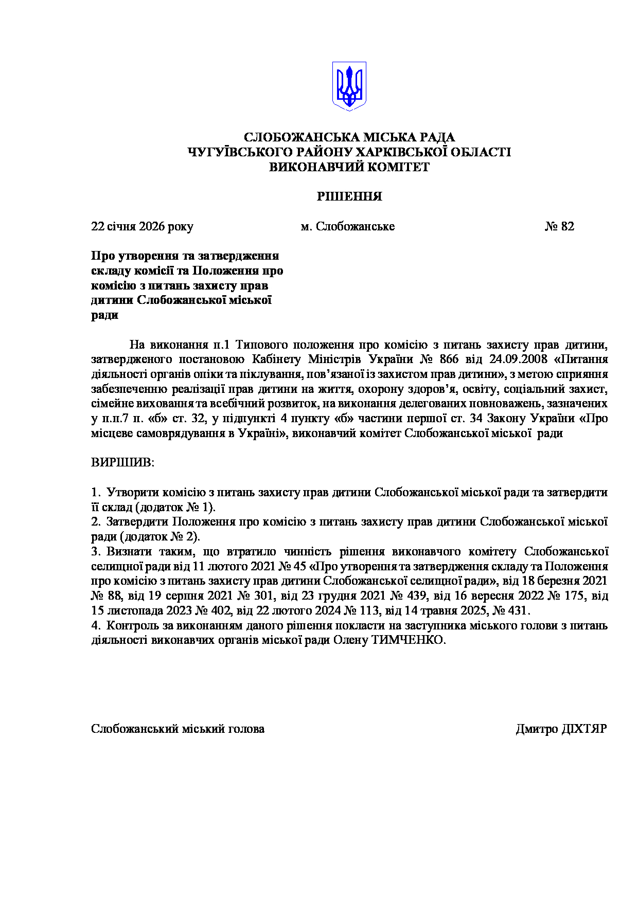 Рішення виконавчого комітету №82 Про утворення та затвердження складу комісії та Положення про комісію з питань захисту прав дитини Слобожанської міської ради.