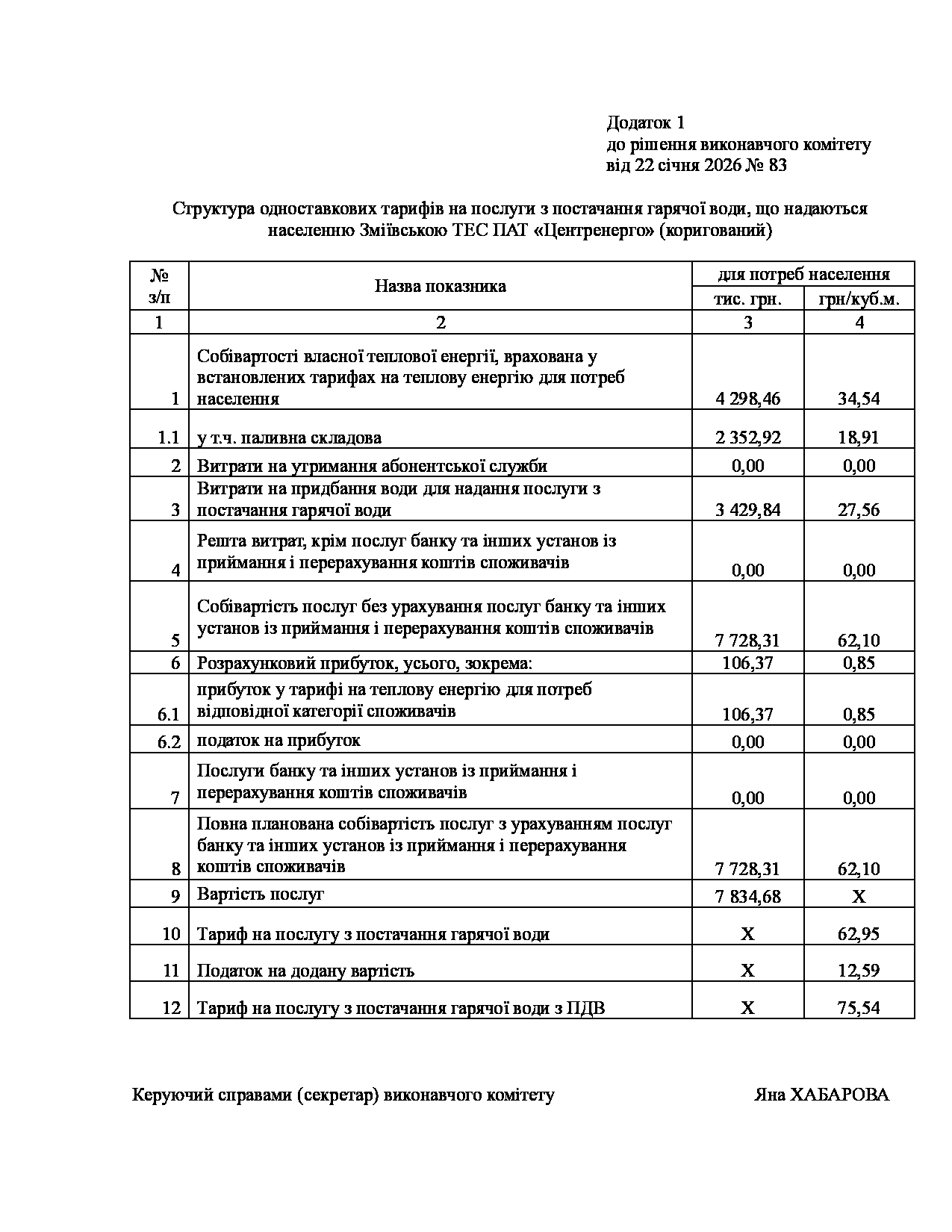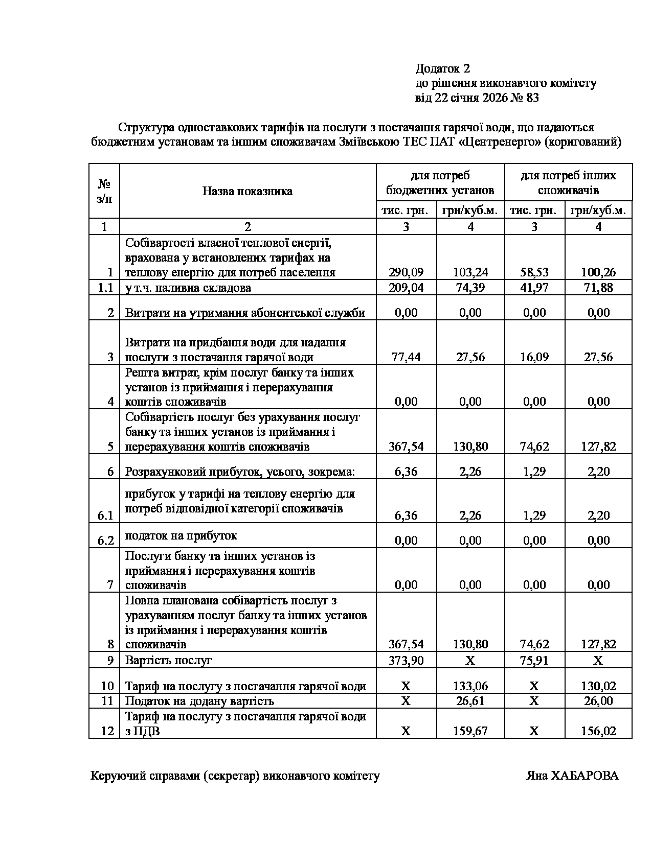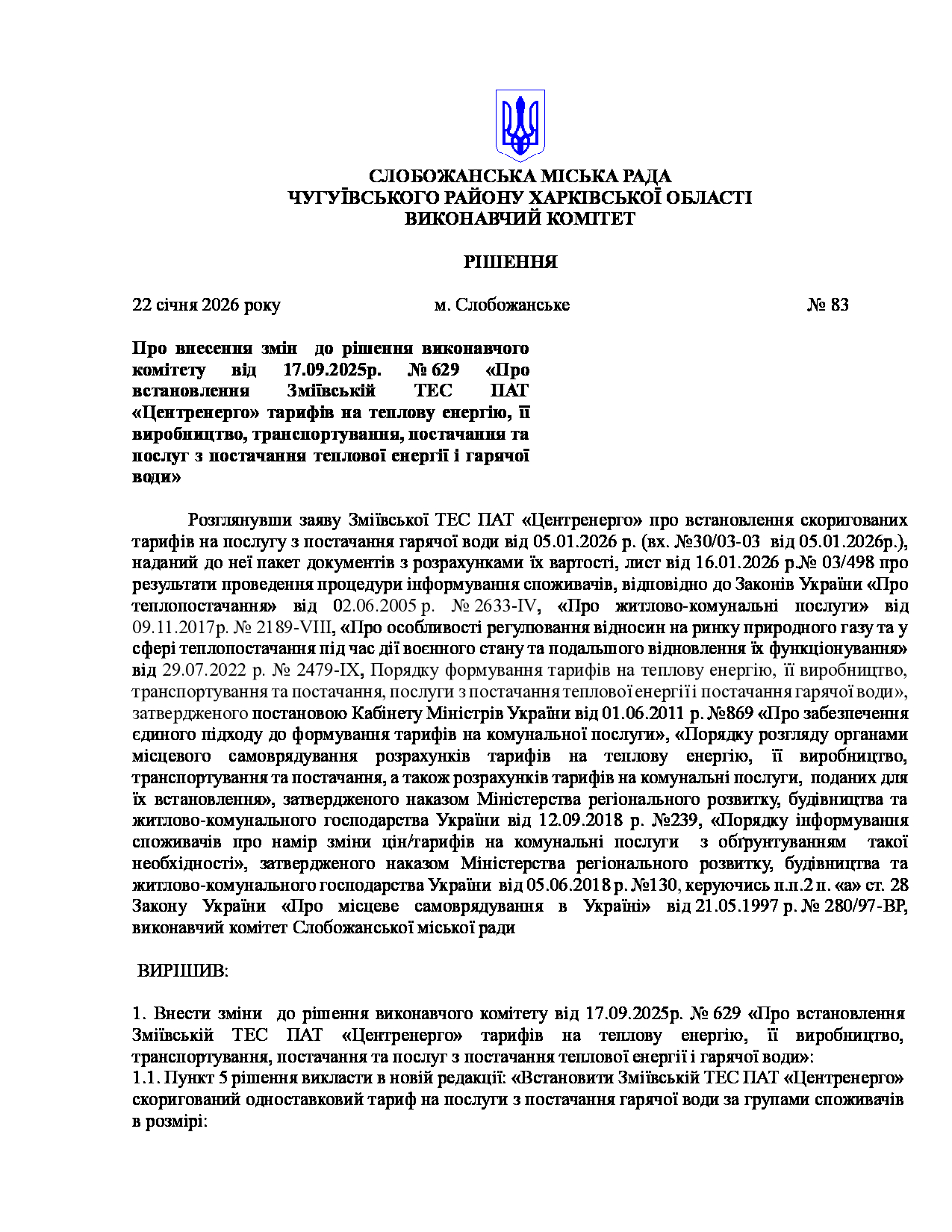 Рішення виконавчого комітету №83 Про внесення змін до рішення виконавчого комітету від 17.09.2025р. № 629 «Про встановлення Зміївській ТЕС ПАТ «Центренерго» тарифів на теплову енергію, її виробництво, транспортування, постачання та послуг з постачання теплової енергії і гарячої води».