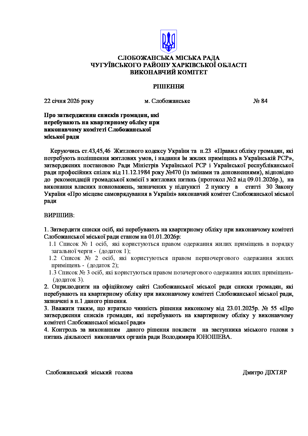 Рішення виконавчого комітету №84 Про затвердження списків громадян, які перебувають на квартирному обліку при виконавчому комітеті Слобожанської міської ради.