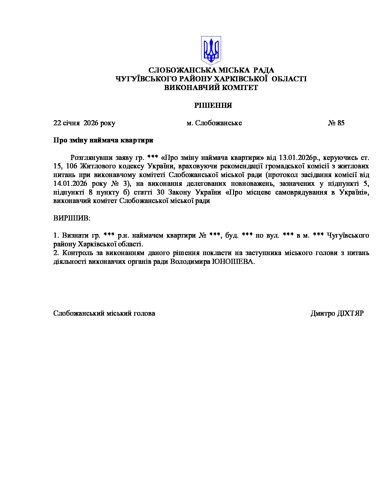 Рішення виконавчого комітету №85 Про зміну наймача квартири.