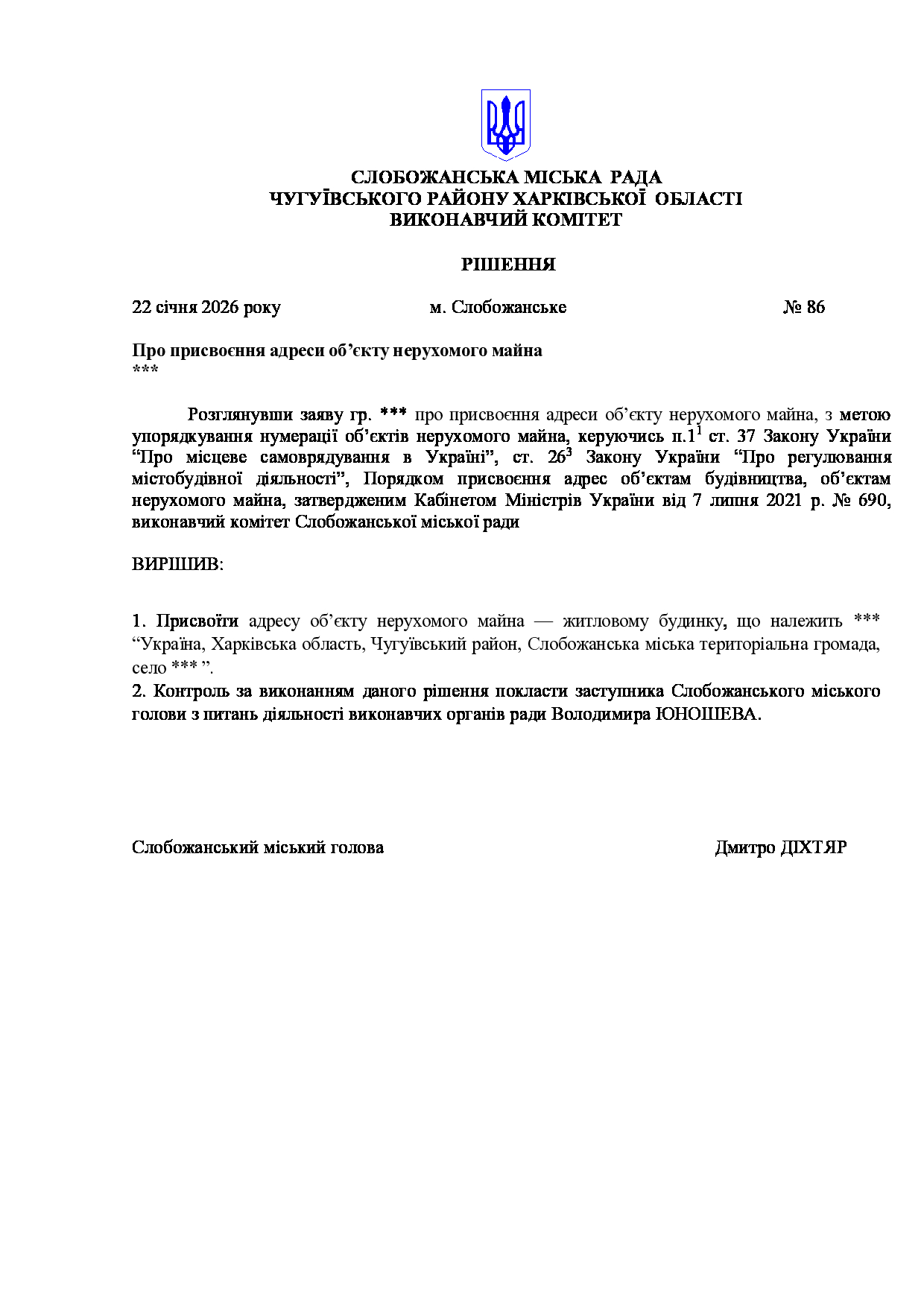 Рішення виконавчого комітету №86 Про присвоєння адреси об’єкту нерухомого майна ***.