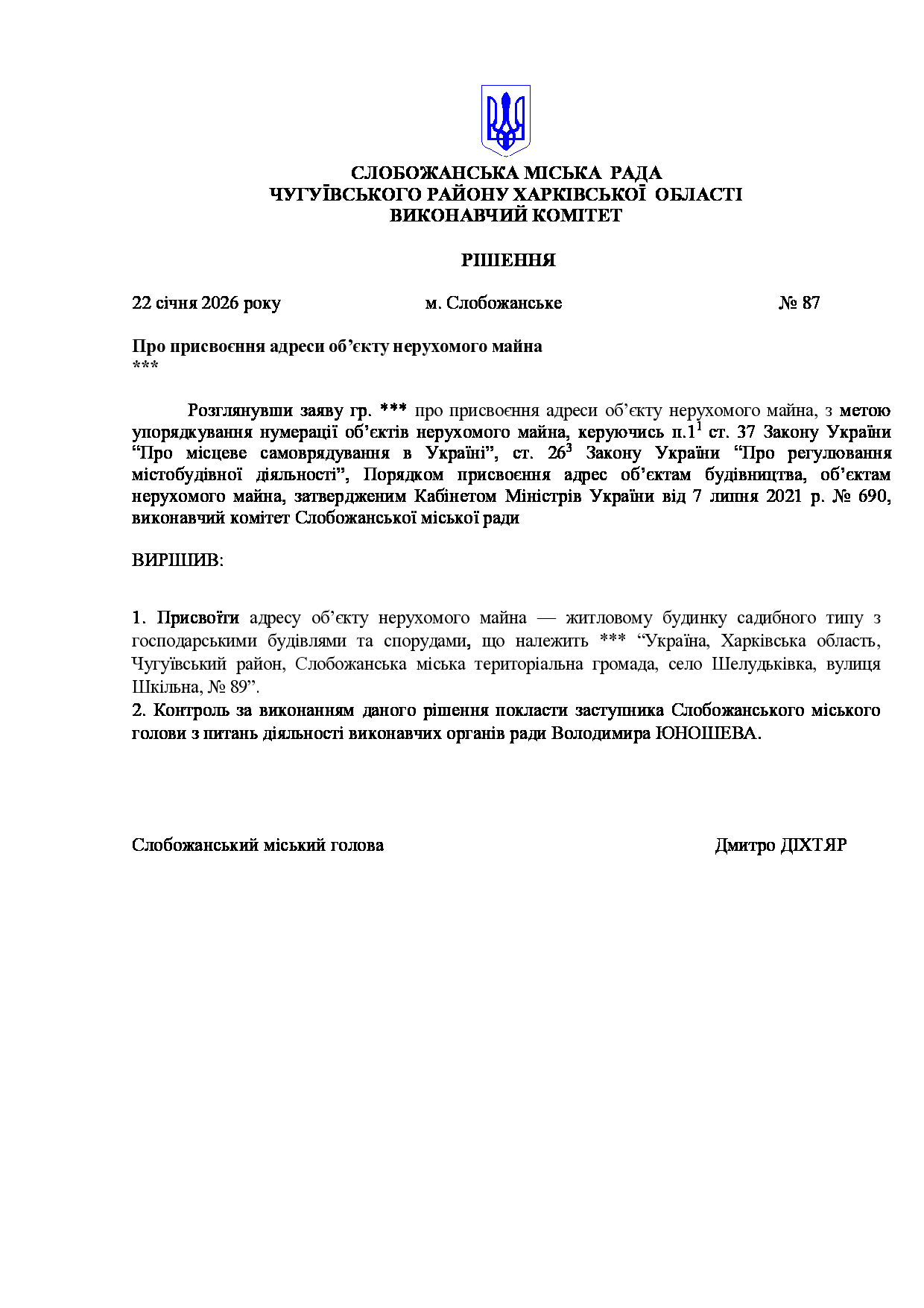 Рішення виконавчого комітету №87 Про присвоєння адреси об’єкту нерухомого майна ***.