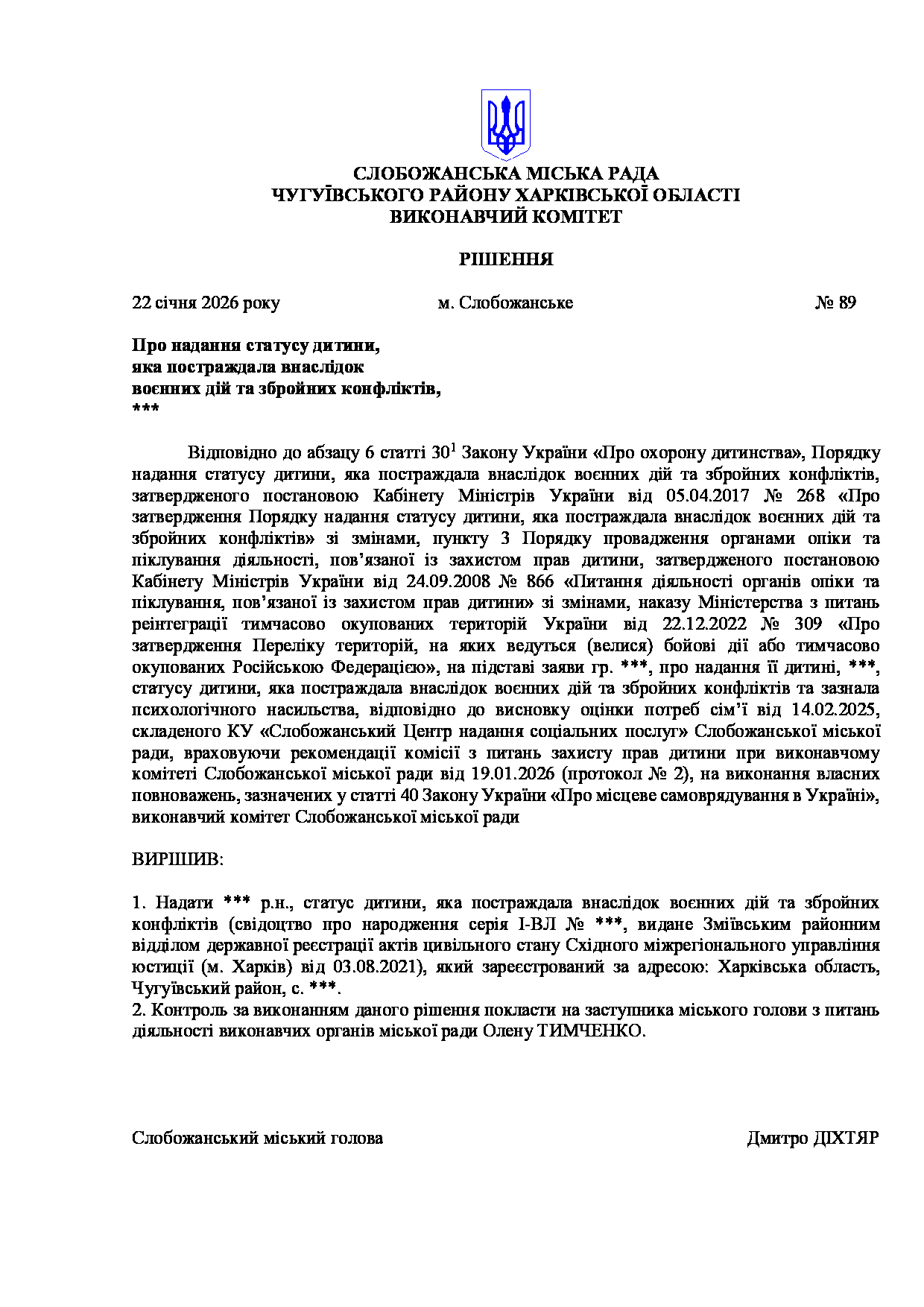 Рішення виконавчого комітету №89 Про надання статусу дитини, яка постраждала внаслідок воєнних дій та збройних конфліктів, ***.