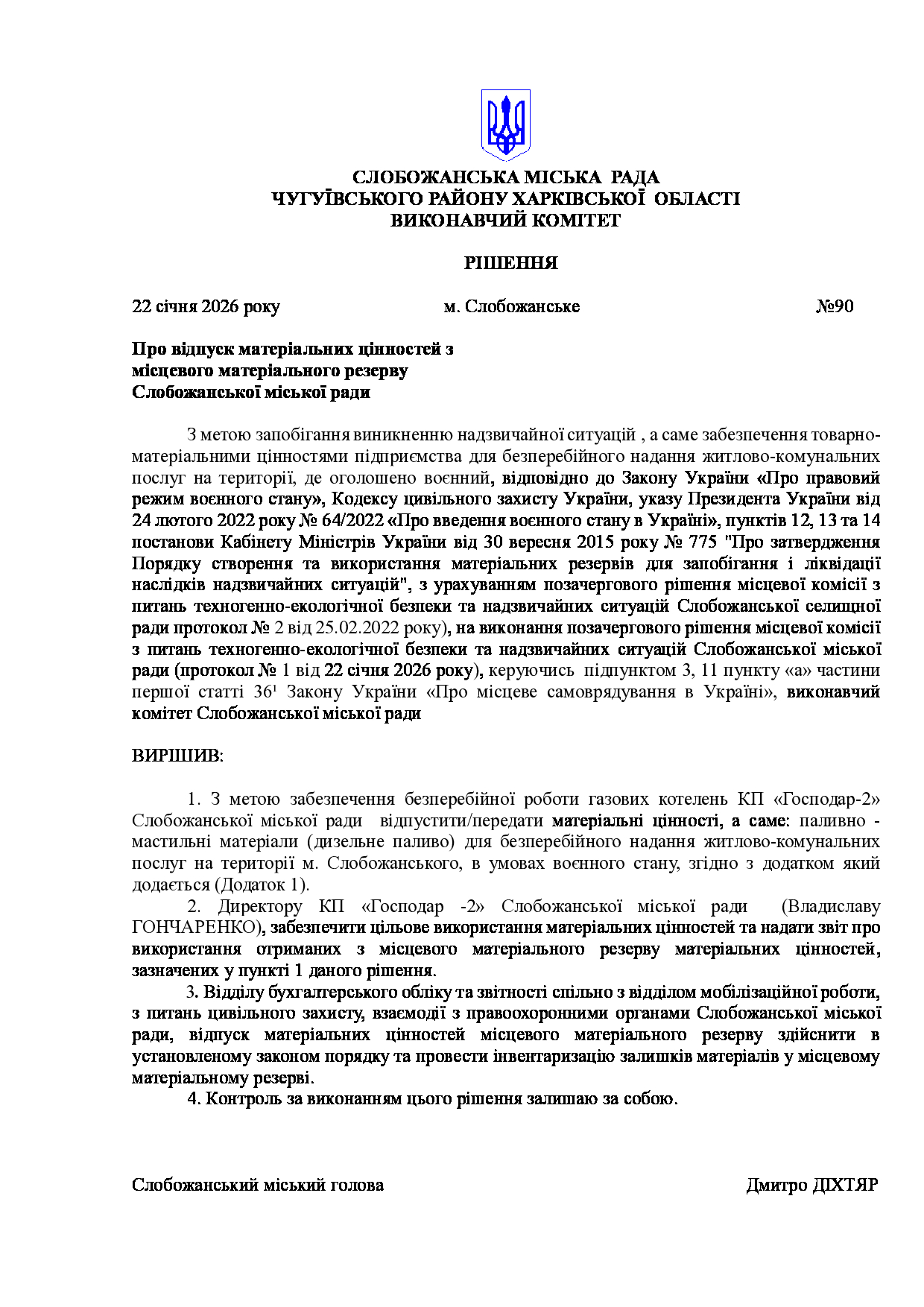 Рішення виконавчого комітету №90 Про відпуск матеріальних цінностей з місцевого матеріального резерву Слобожанської міської ради