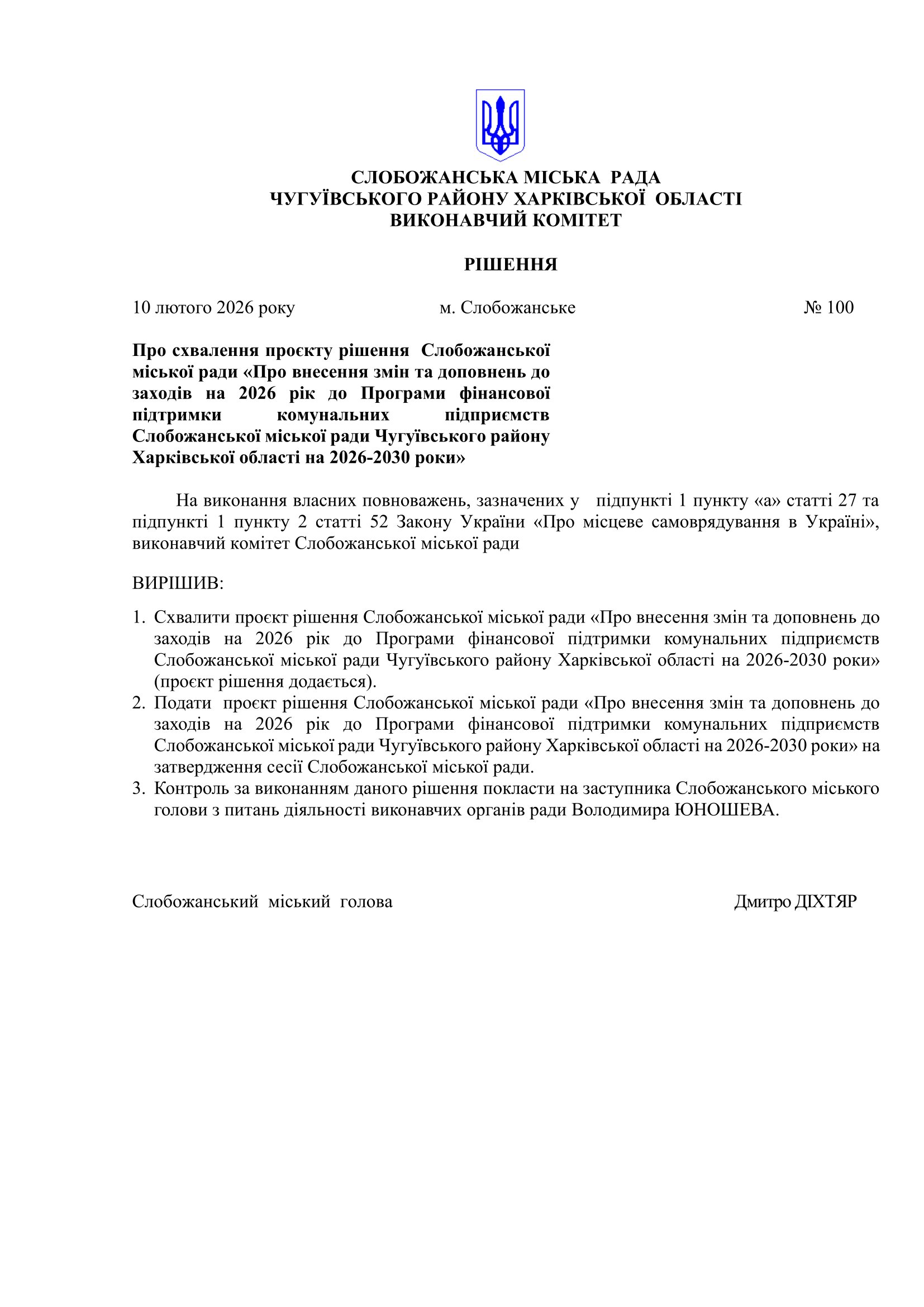 Рішення виконавчого комітету №100 Про схвалення проєкту рішення Слобожанської міської ради «Про внесення змін та доповнень до заходів на 2026 рік до Програми фінансової підтримки комунальних підприємств Слобожанської міської ради Чугуївського району Харківської області на 2026-2030 роки».