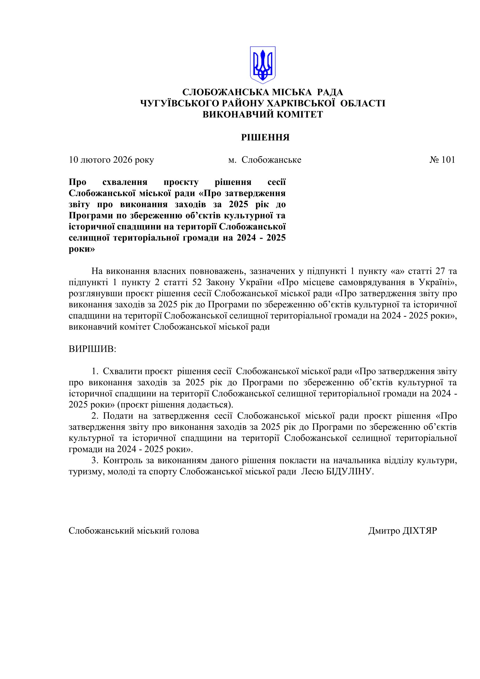 Рішення виконавчого комітету №101 Про схвалення проєкту рішення сесії Слобожанської міської ради «Про затвердження звіту про виконання заходів за 2025 рік до Програми по збереженню об’єктів культурної та історичної спадщини на території Слобожанської селищної територіальної громади на 2024 - 2025 роки».