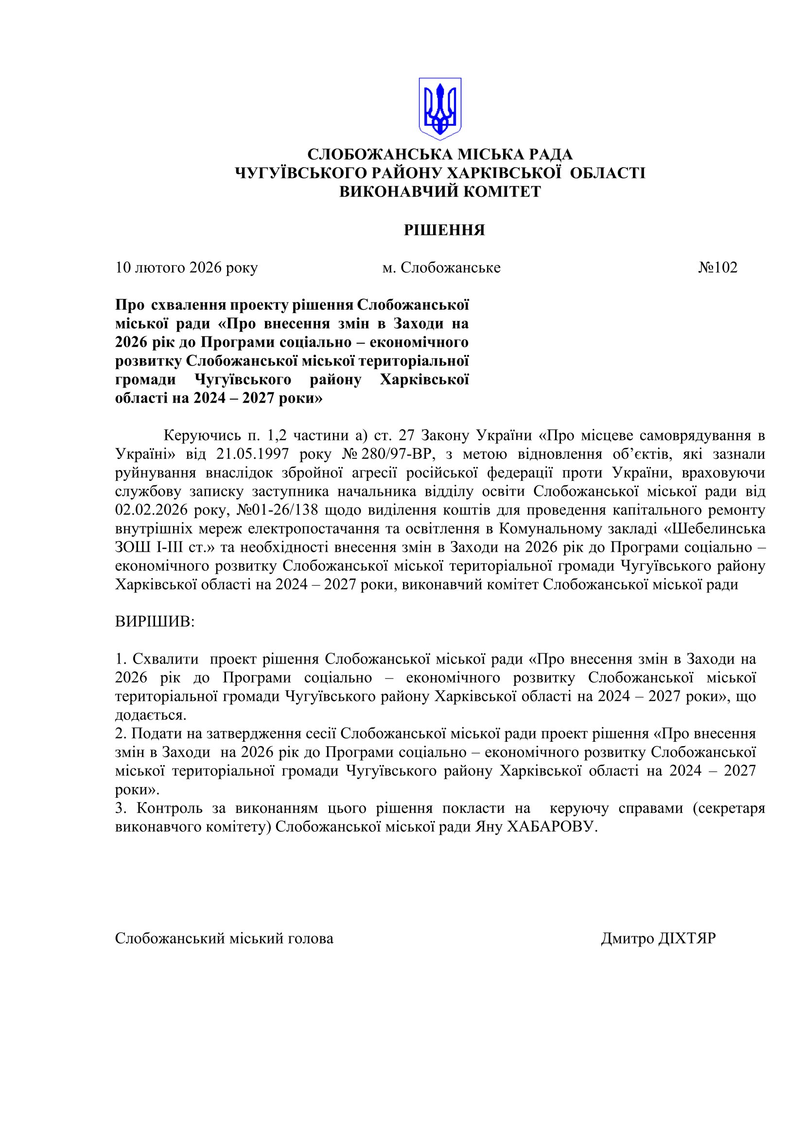 Рішення виконавчого комітету №102 Про схвалення проекту рішення Слобожанської міської ради «Про внесення змін в Заходи на 2026 рік до Програми соціально – економічного розвитку Слобожанської міської територіальної громади Чугуївського району Харківської області на 2024 – 2027 роки».