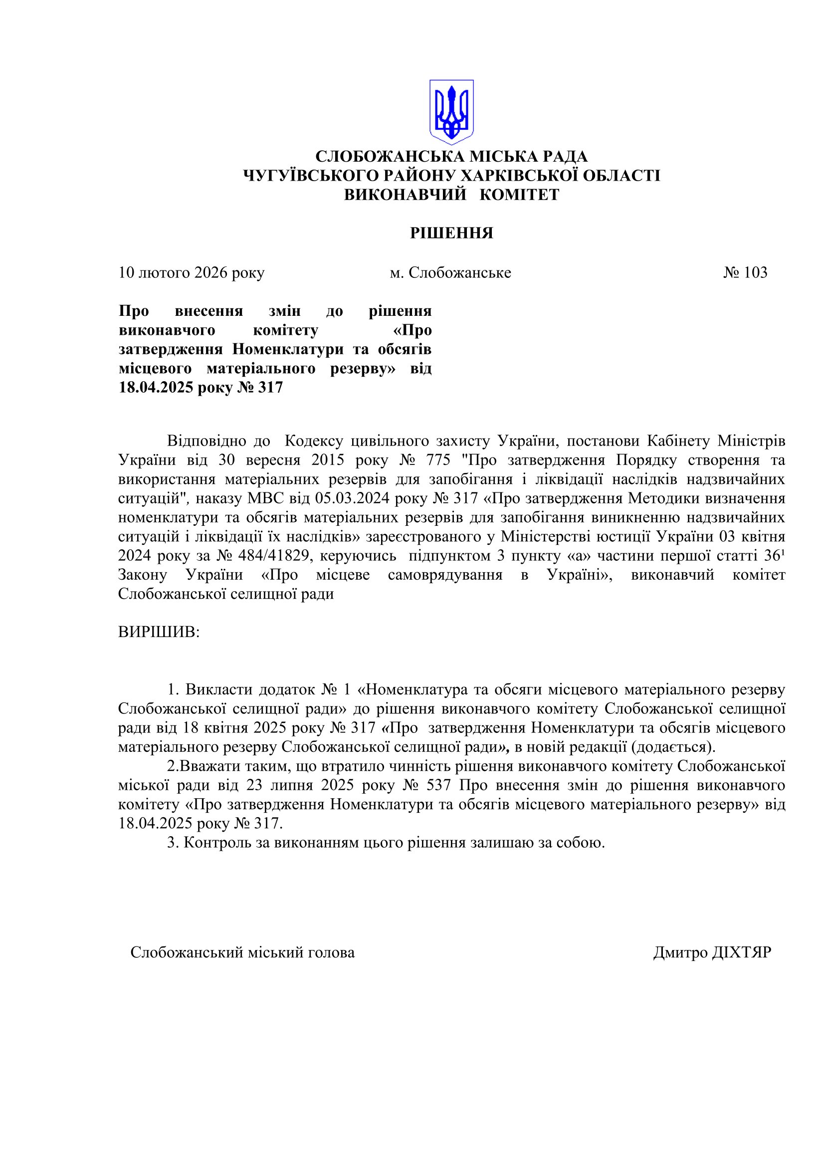 Рішення виконавчого комітету №103 Про внесення змін до рішення виконавчого комітету «Про затвердження Номенклатури та обсягів місцевого матеріального резерву» від 18.04.2025 року № 317.