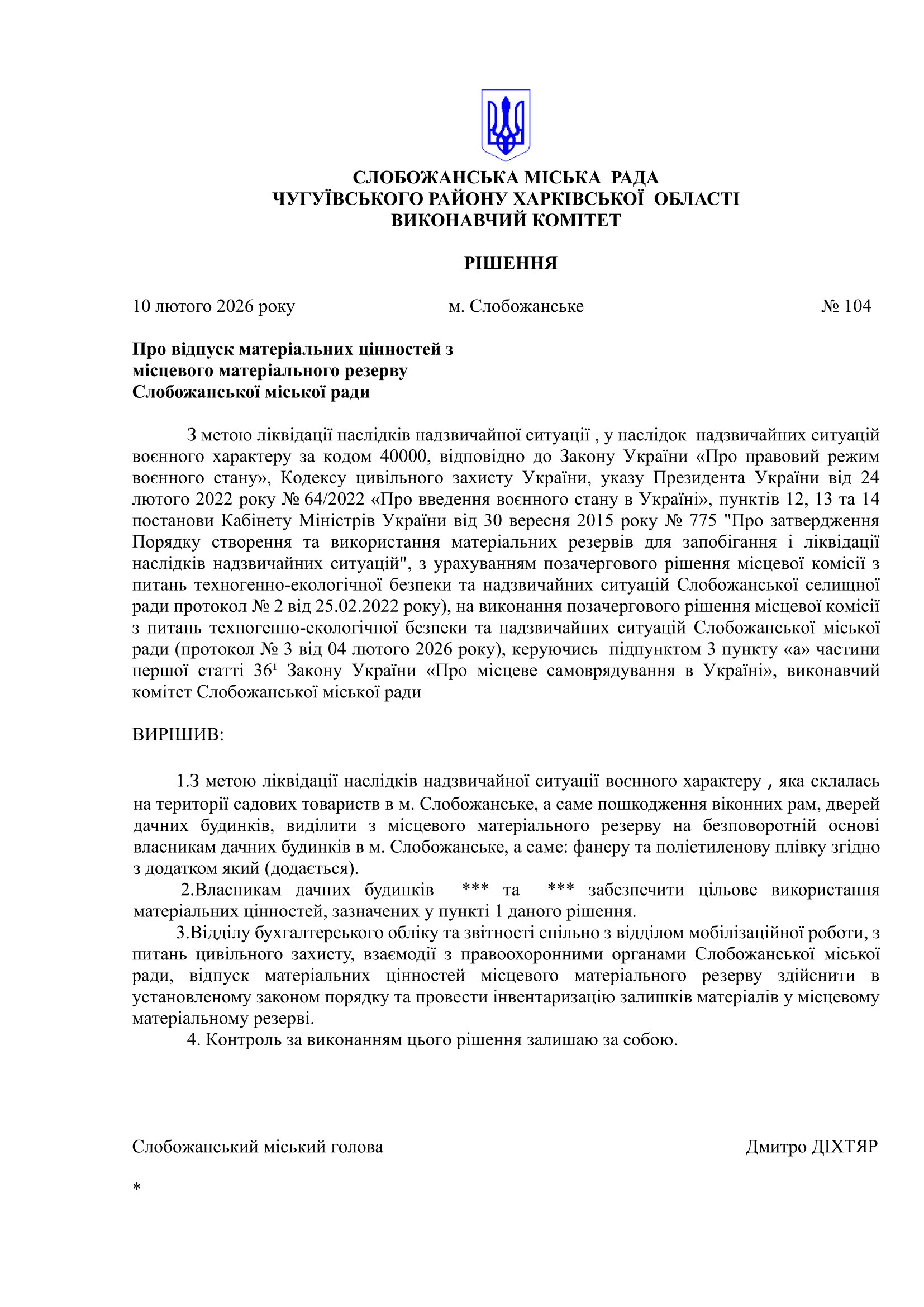 Рішення виконавчого комітету №104 Про відпуск матеріальних цінностей з місцевого матеріального резерву Слобожанської міської ради.