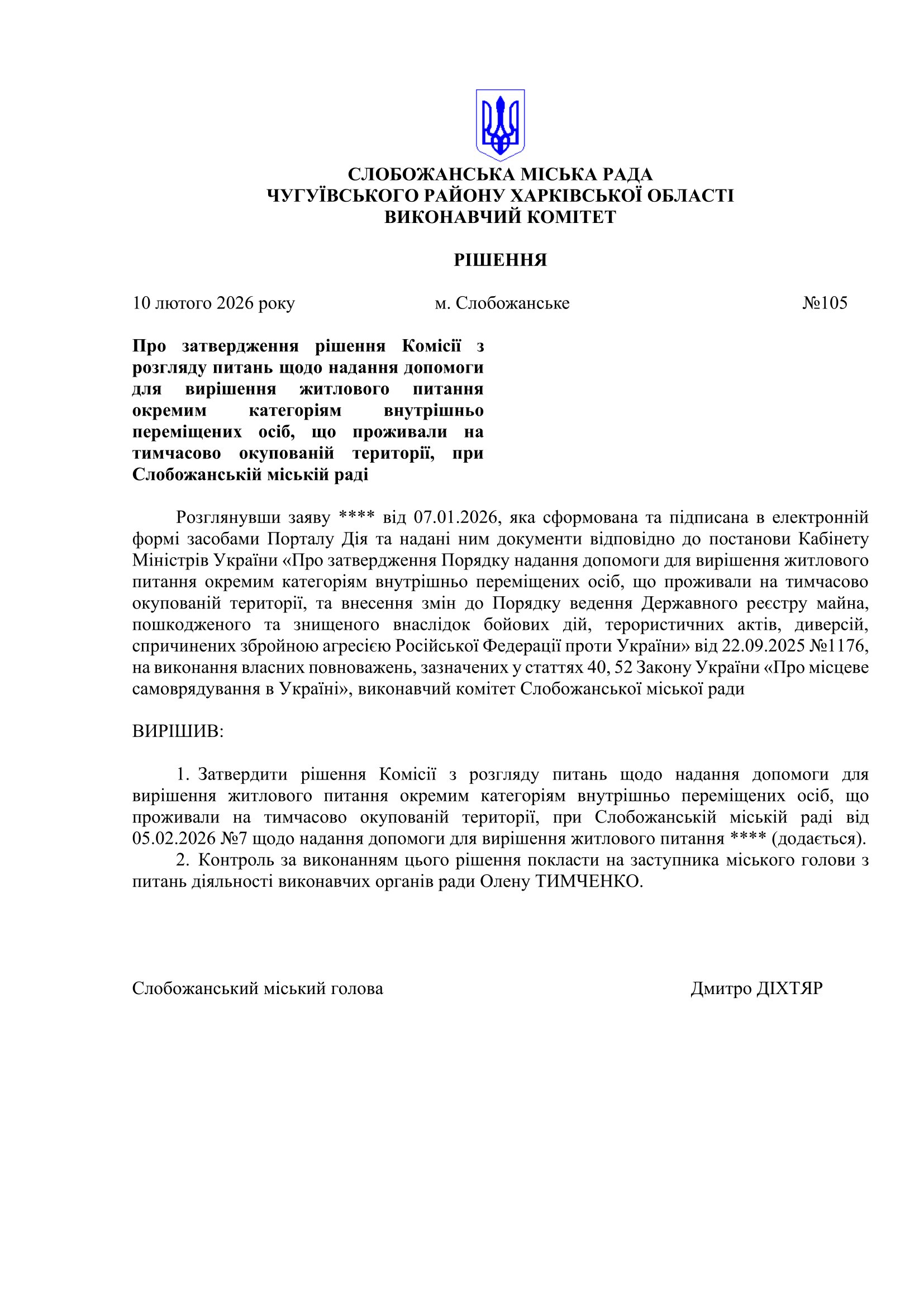 Рішення виконавчого комітету №105 Про затвердження рішення Комісії з розгляду питань щодо надання допомоги для вирішення житлового питання окремим категоріям внутрішньо переміщених осіб, що проживали на тимчасово окупованій території, при Слобожанській міській раді.