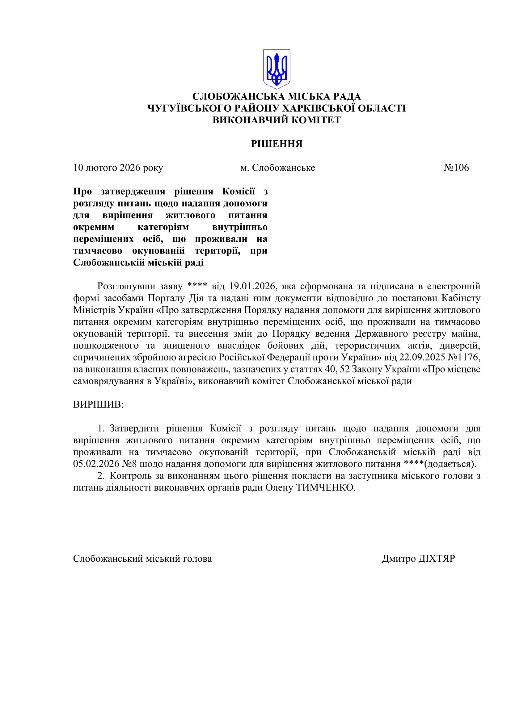 Рішення виконавчого комітету №106 Про затвердження рішення Комісії з розгляду питань щодо надання допомоги для вирішення житлового питання окремим категоріям внутрішньо переміщених осіб, що проживали на тимчасово окупованій території, при Слобожанській міській раді.
