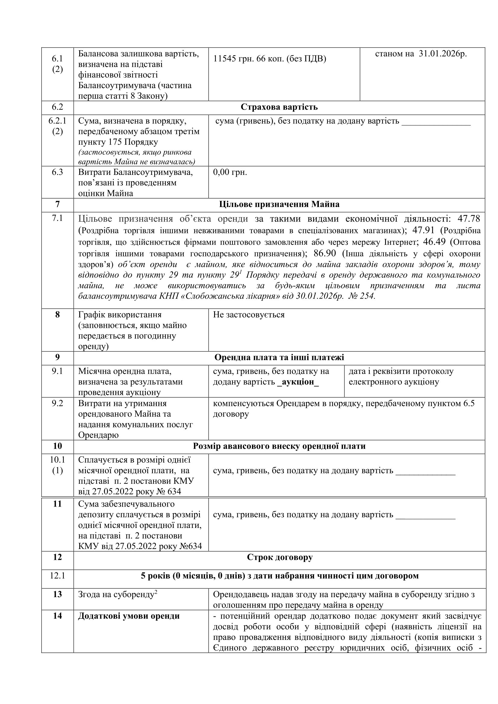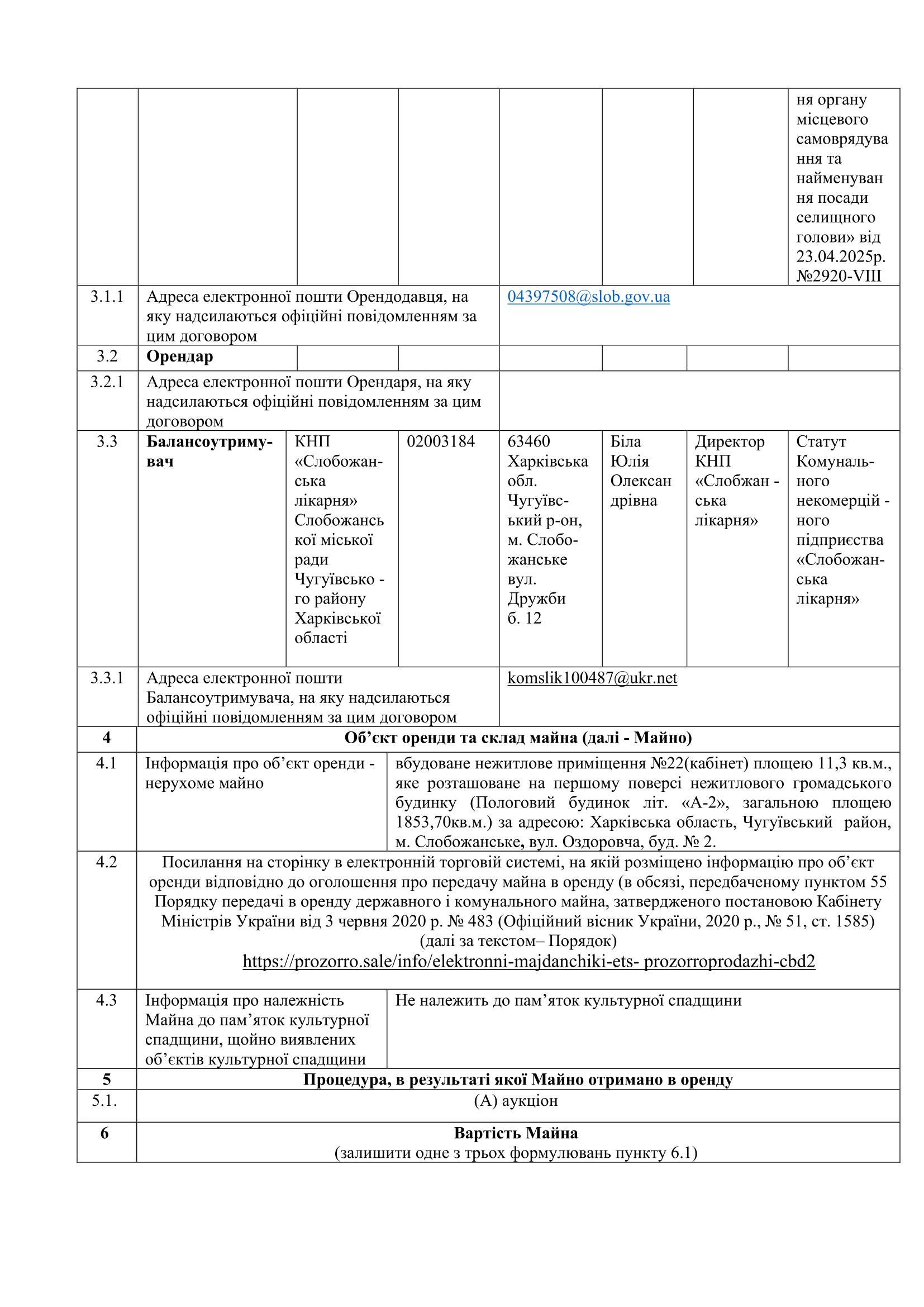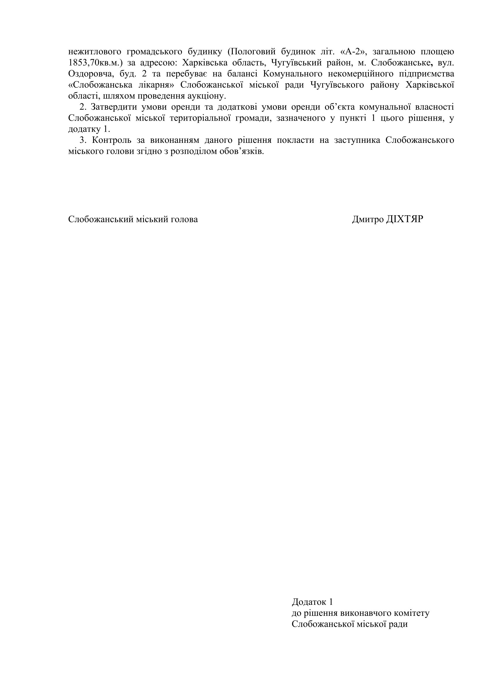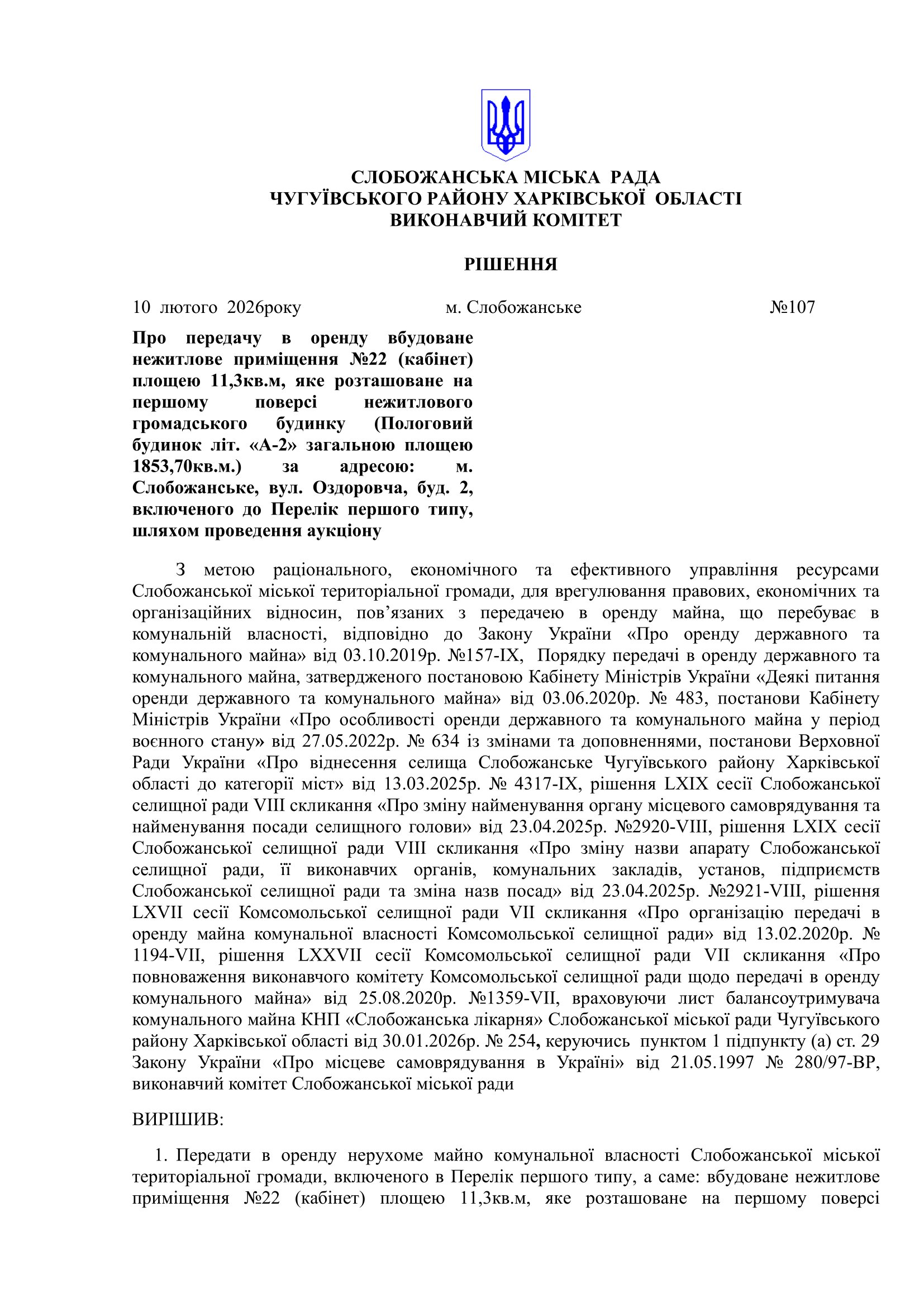 Рішення виконавчого комітету №107 Про передачу в оренду вбудоване нежитлове приміщення №22 (кабінет) площею 11,3кв.м, яке розташоване на першому поверсі нежитлового громадського будинку (Пологовий будинок літ. «А-2» загальною площею 1853,70кв.м.) за адресою: м. Слобожанське, вул. Оздоровча, буд. 2, включеного до Перелік першого типу, шляхом проведення аукціону.