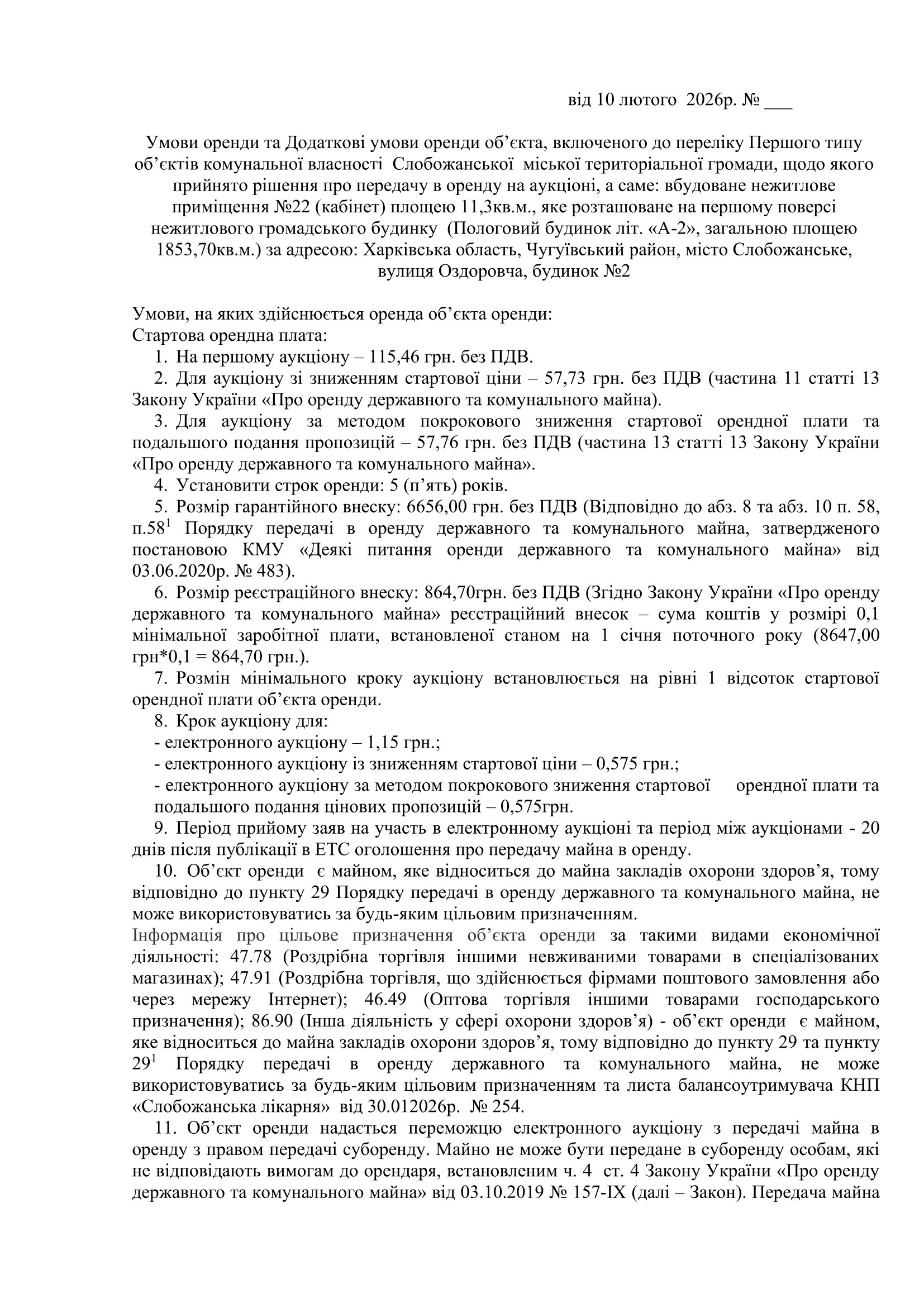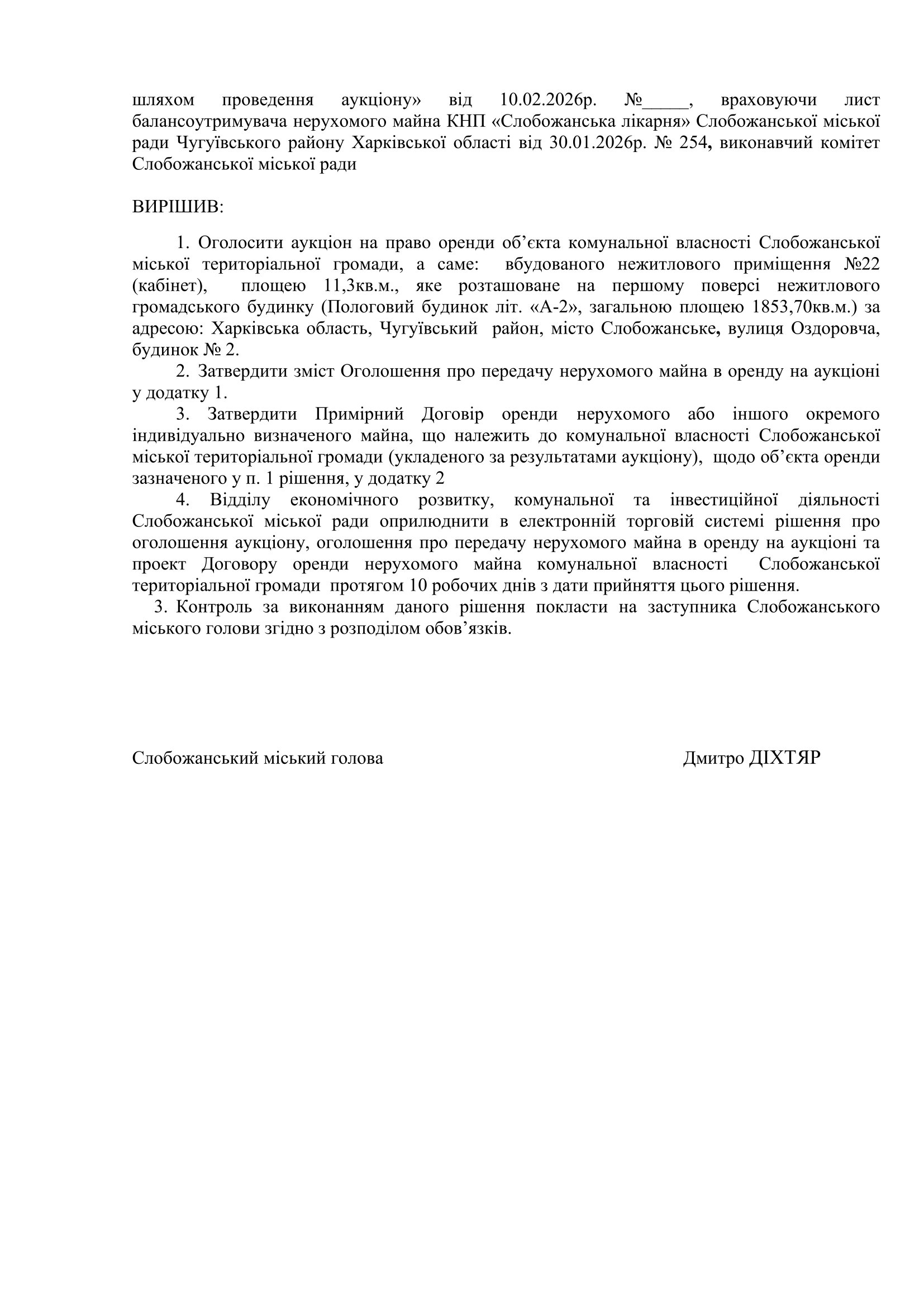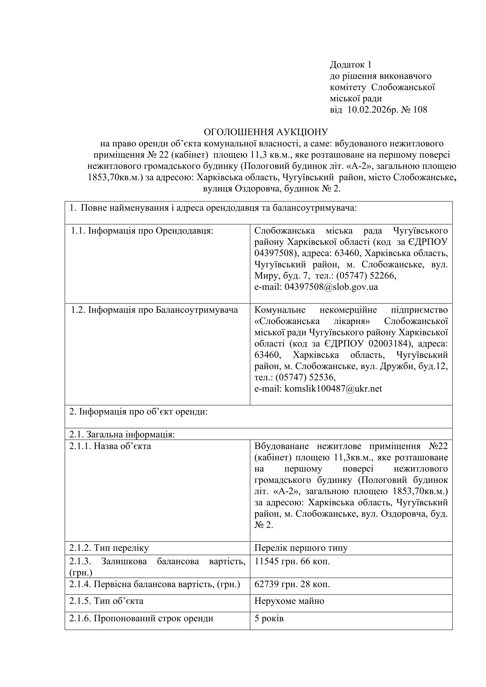 Рішення виконавчого комітету №108 Про оголошення аукціону на право оренди об’єкта комунальної власності, а саме: вбудованого нежитлового приміщення №22 (кабінет) площею 11,3кв.м., розташованого на першому поверсі нежитлового громадського будинку (Пологовий будинок літ. «А-2» загальною площею 1853,70кв.м.) за адресою: Харківська область, Чугуївський район, м. Слобожанське, вул. Оздоровча, буд. 2.