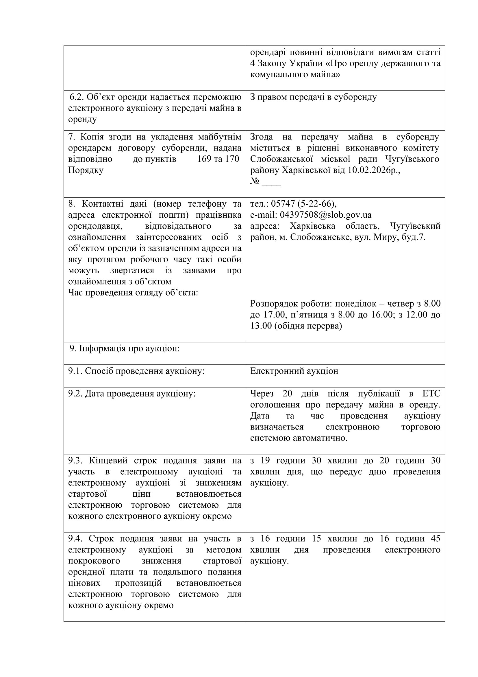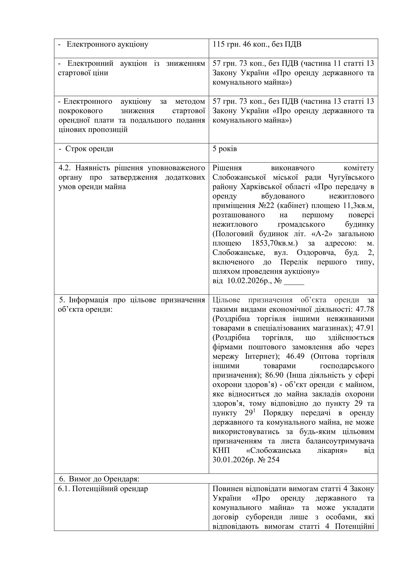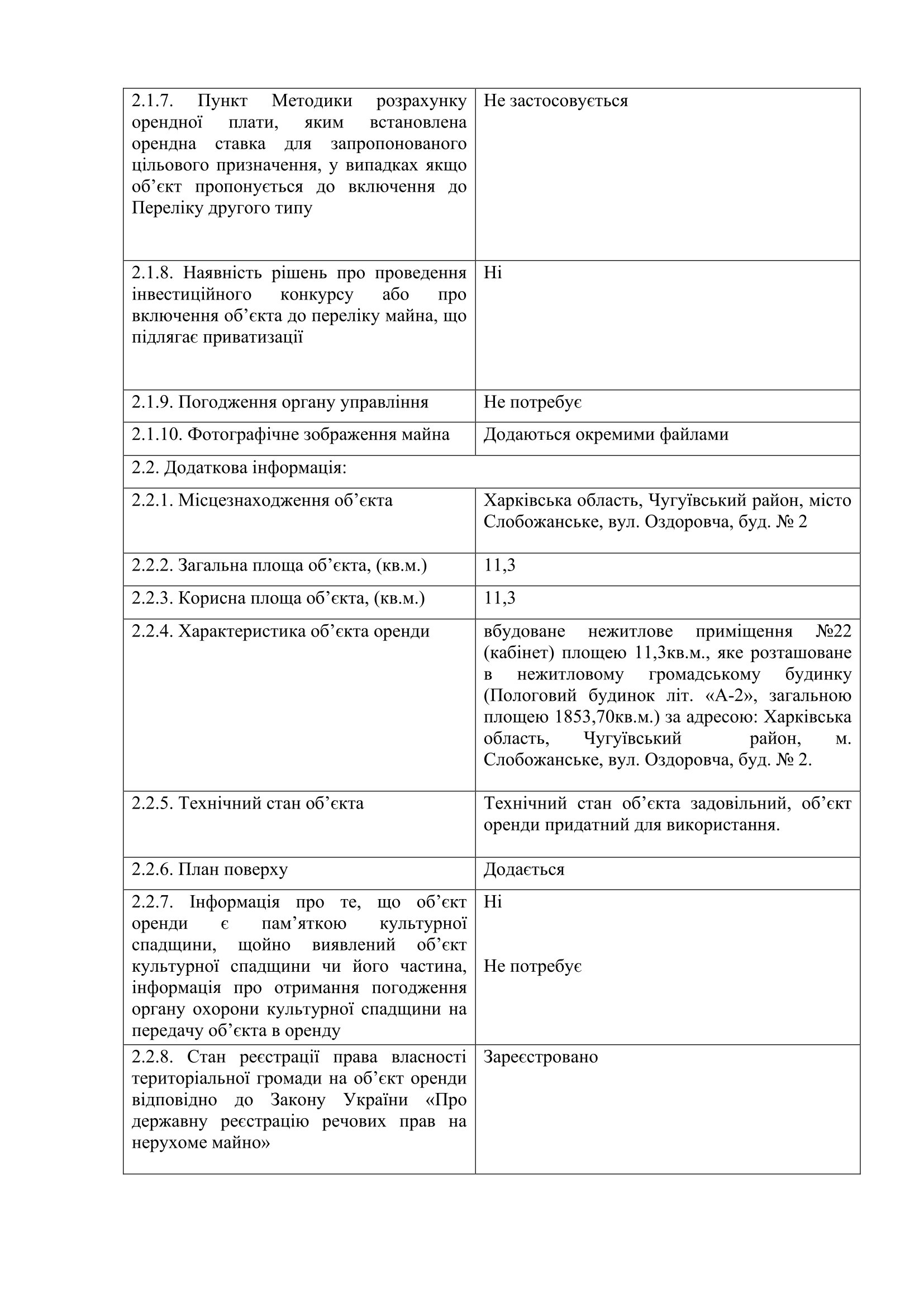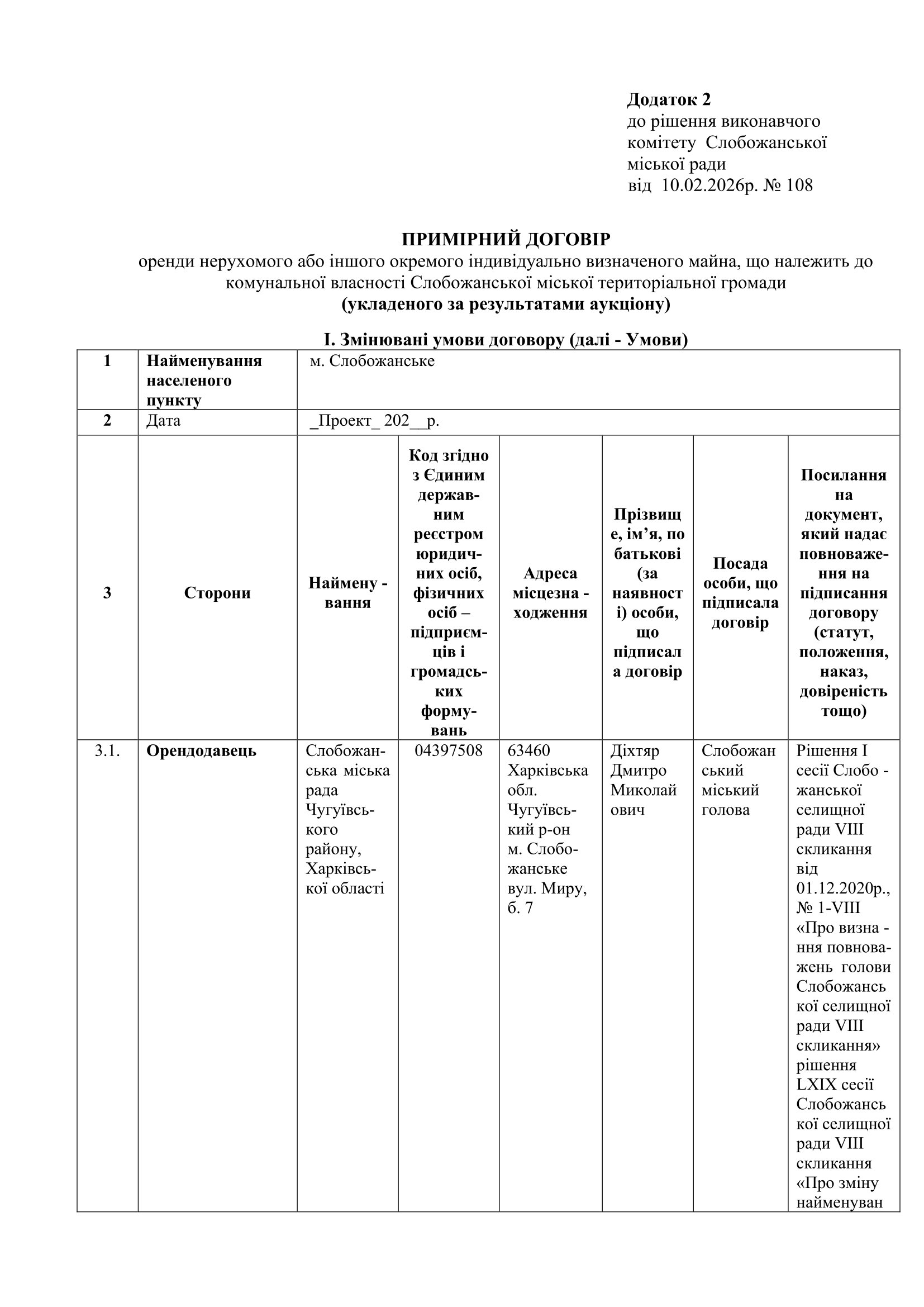 Рішення виконавчого комітету №108 Про оголошення аукціону на право оренди об’єкта комунальної власності, а саме: вбудованого нежитлового приміщення №22 (кабінет) площею 11,3кв.м., розташованого на першому поверсі нежитлового громадського будинку (Пологовий будинок літ. «А-2» загальною площею 1853,70кв.м.) за адресою: Харківська область, Чугуївський район, м. Слобожанське, вул. Оздоровча, буд. 2.