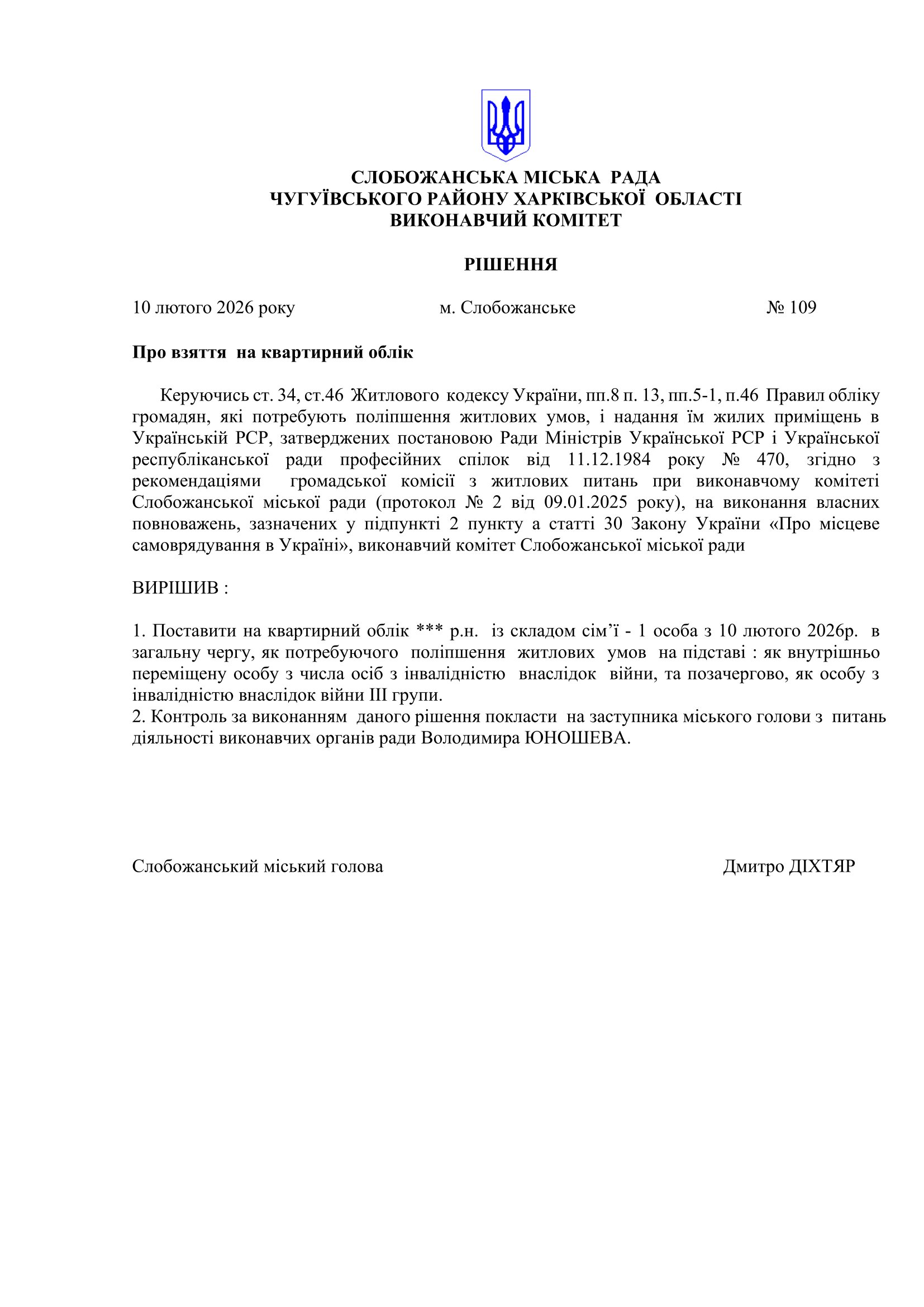Рішення виконавчого комітету №109 Про взяття на квартирний облік.