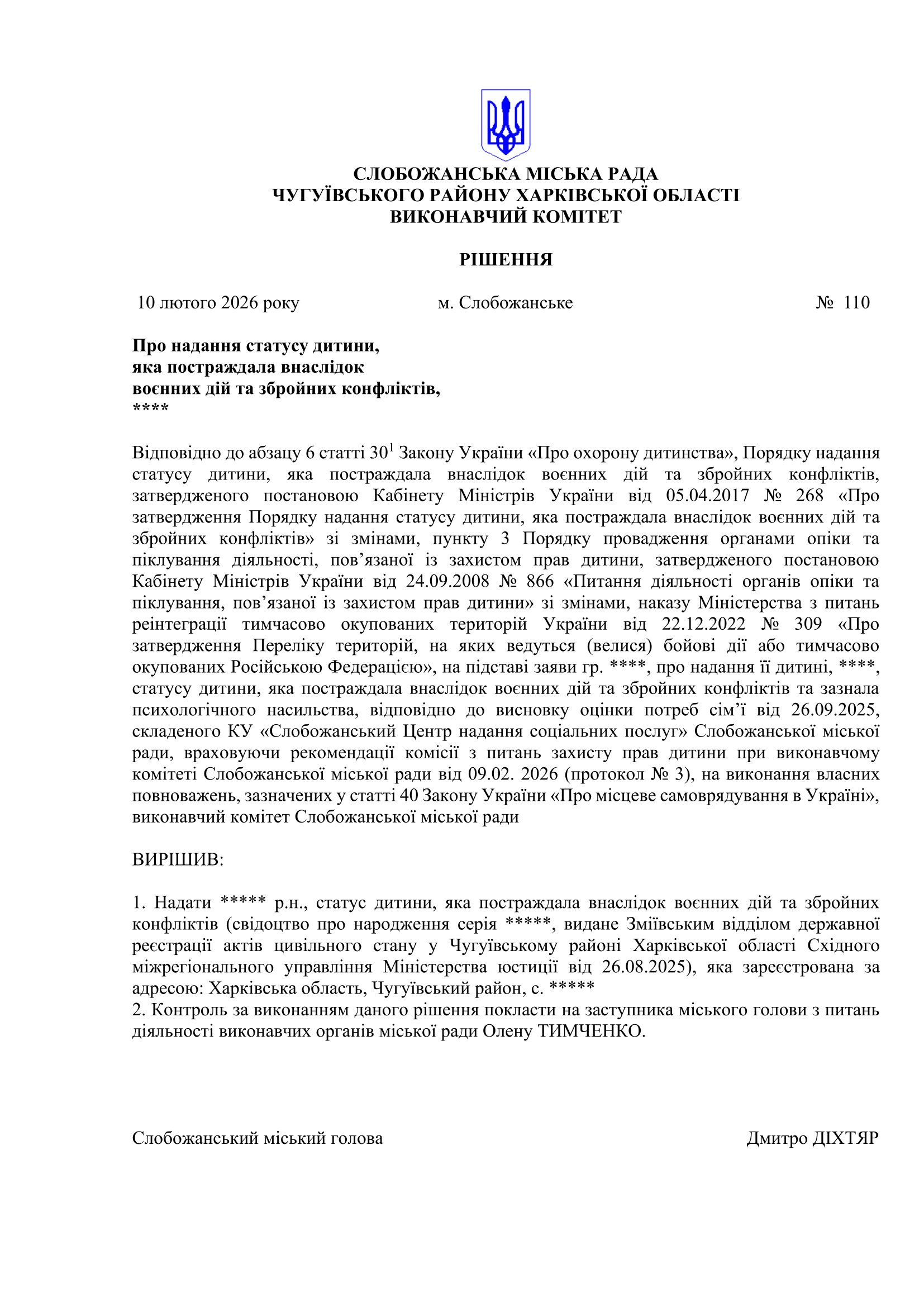 Рішення виконавчого комітету №110 Про надання статусу дитини, яка постраждала внаслідок воєнних дій та збройних конфліктів, ***.
