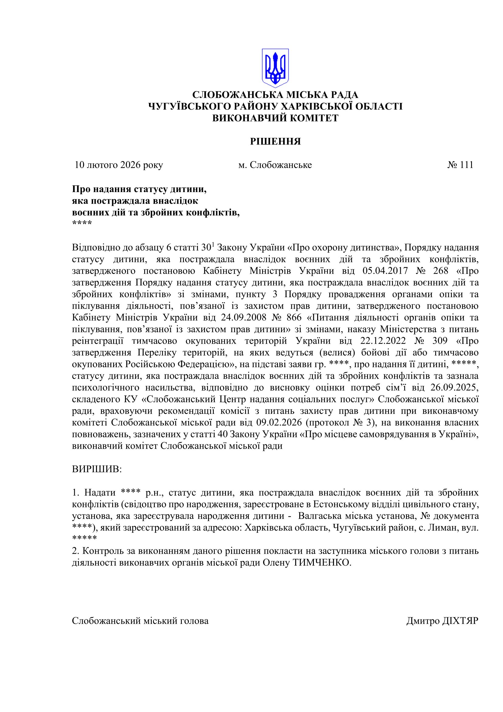 Рішення виконавчого комітету №111 Про надання статусу дитини, яка постраждала внаслідок воєнних дій та збройних конфліктів, ***.