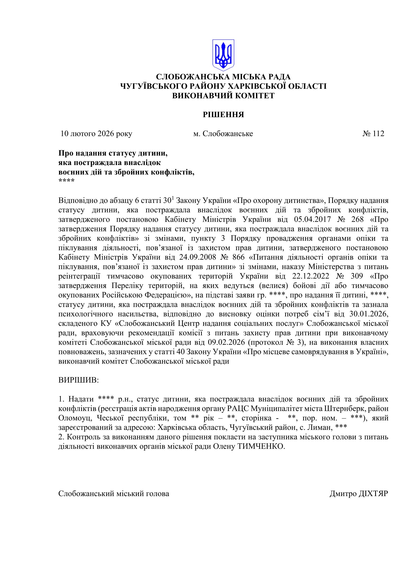 Рішення виконавчого комітету №112 Про надання статусу дитини, яка постраждала внаслідок воєнних дій та збройних конфліктів, ***.