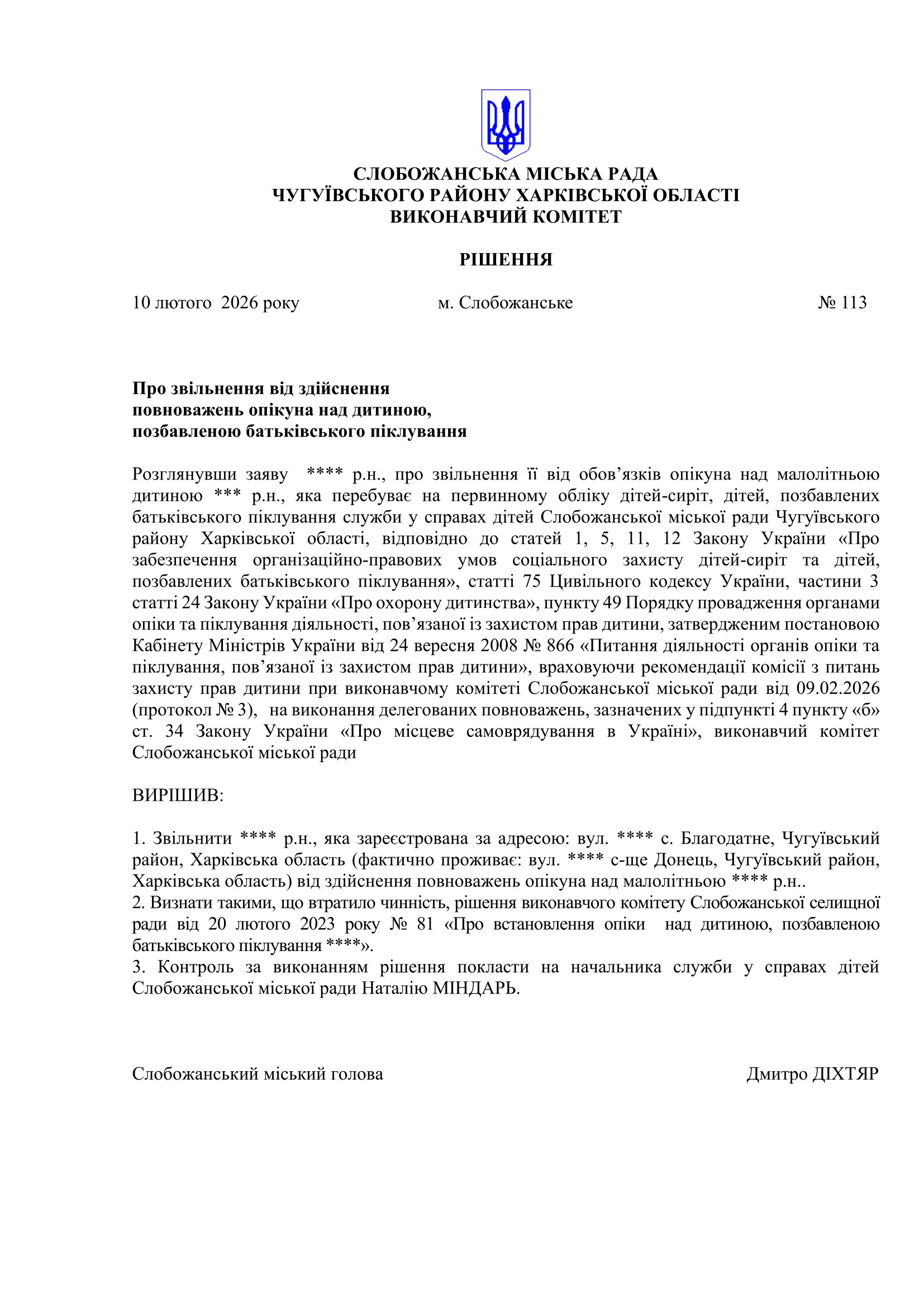 Рішення виконавчого комітету №113 Про звільнення від здійснення повноважень опікуна над дитиною, позбавленою батьківського піклування.