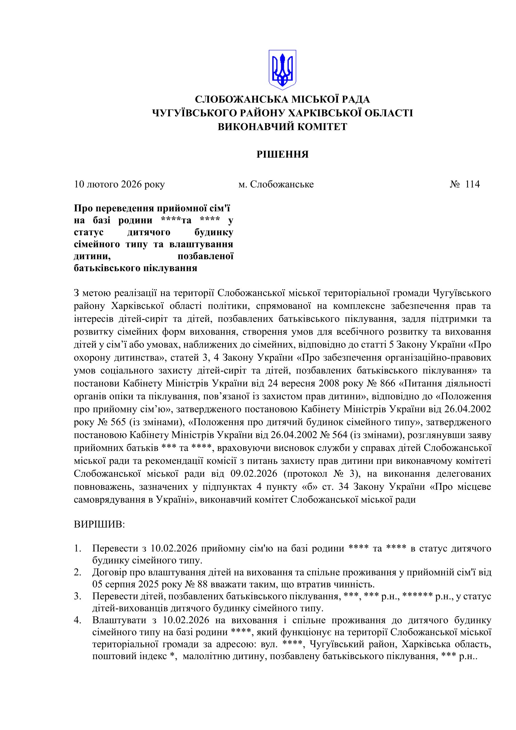 Рішення виконавчого комітету №114 Про переведення прийомної сім'ї на базі родини *** та *** у статус дитячого будинку сімейного типу та влаштування дитини, позбавленої батьківського піклування.