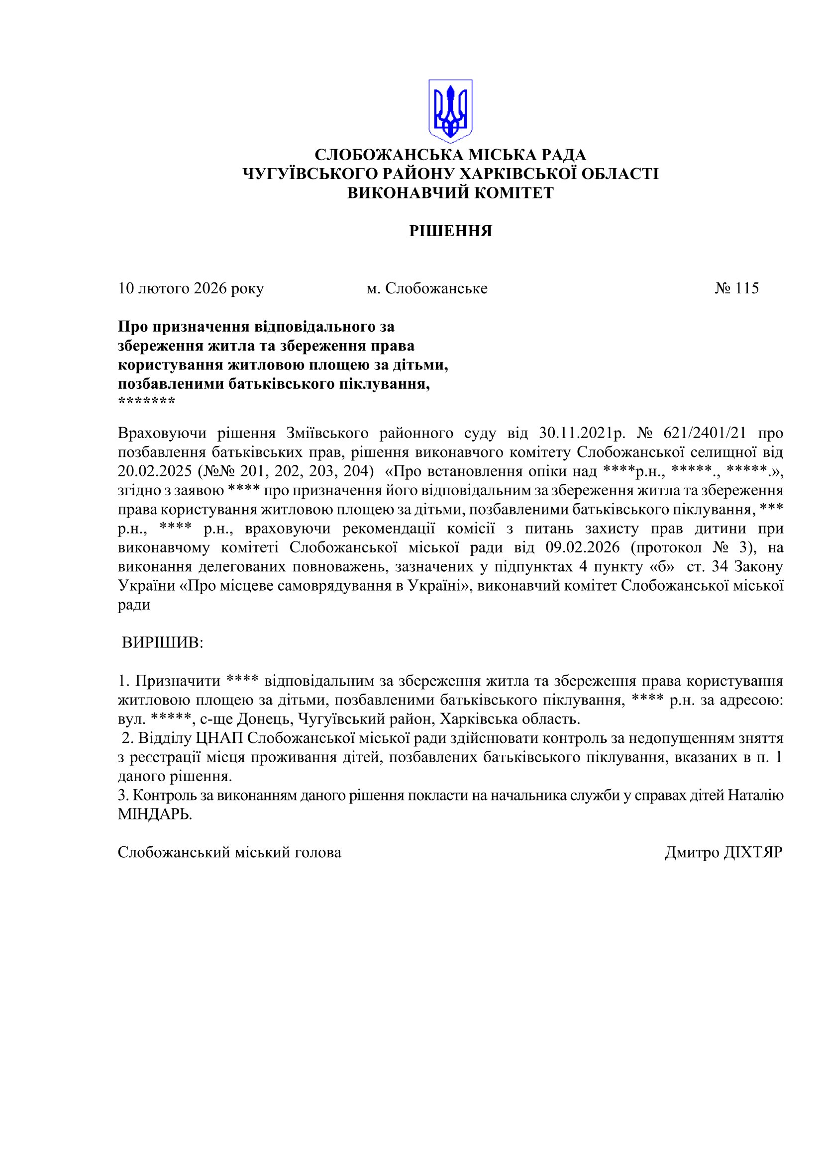 Рішення виконавчого комітету №115 Про призначення відповідального за збереження житла та збереження права користування житловою площею за дітьми, позбавленими батьківського піклування, *****, ***, ***.