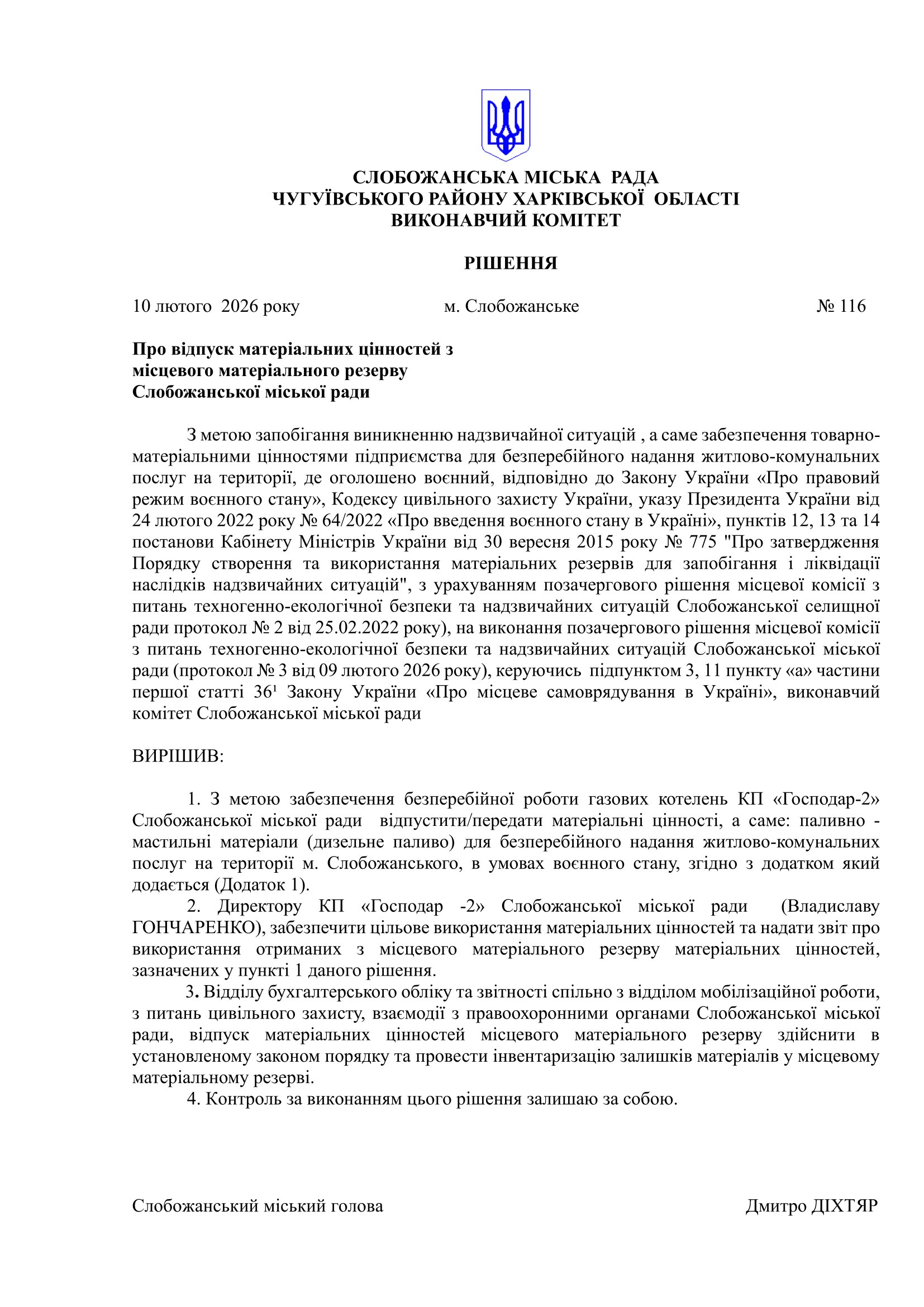 Рішення виконавчого комітету №116 Про відпуск матеріальних цінностей з місцевого матеріального резерву Слобожанської міської ради.