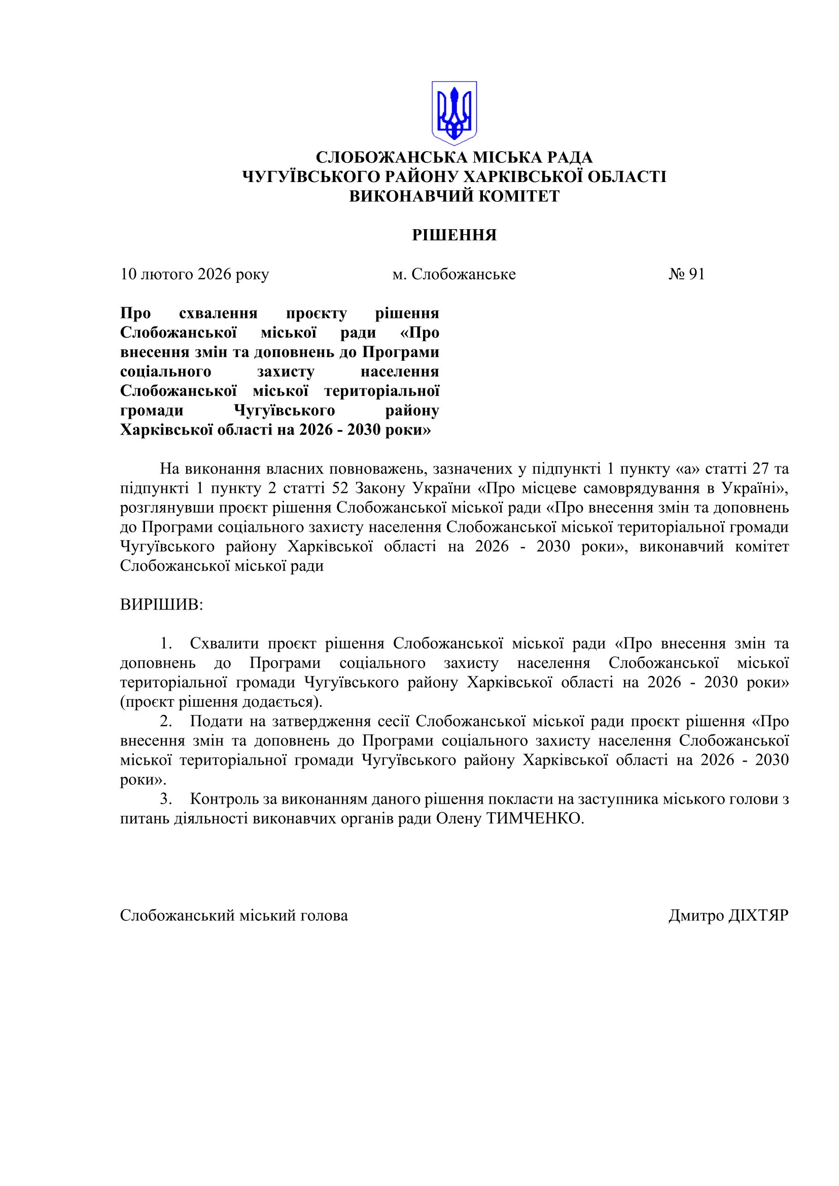 Рішення виконавчого комітету №91 Про схвалення проєкту рішення Слобожанської міської ради «Про внесення змін та доповнень до Програми соціального захисту населення Слобожанської міської територіальної громади Чугуївського району Харківської області на 2026 - 2030 роки».