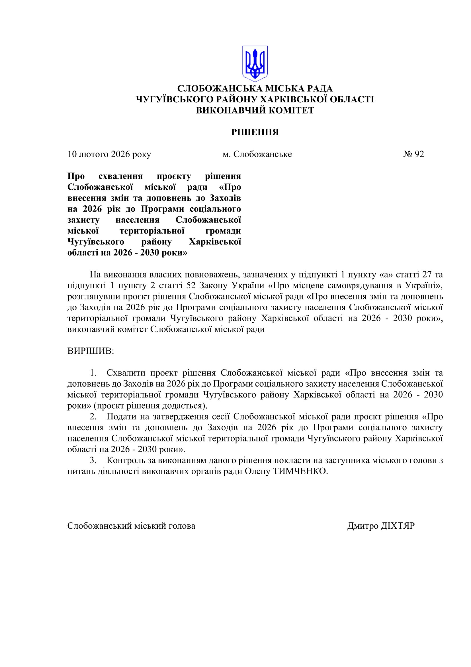 Рішення виконавчого комітету №92 Про схвалення проєкту рішення Слобожанської міської ради «Про внесення змін та доповнень до Заходів на 2026 рік до Програми соціального захисту населення Слобожанської міської територіальної громади Чугуївського району Харківської області на 2026 - 2030 роки».