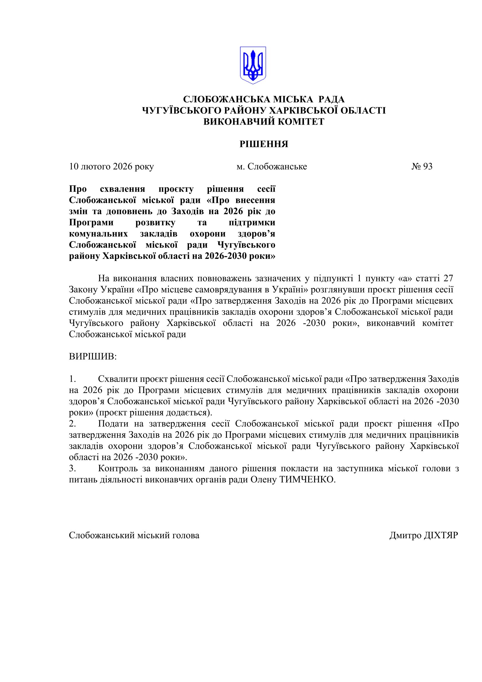 Рішення виконавчого комітету №93 Про схвалення проєкту рішення сесії Слобожанської міської ради «Про внесення змін до Програми місцевих стимулів для медичних працівників закладів охорони здоров’я Слобожанської міської ради Чугуївського району Харківської області на 2026 -2030 роки».