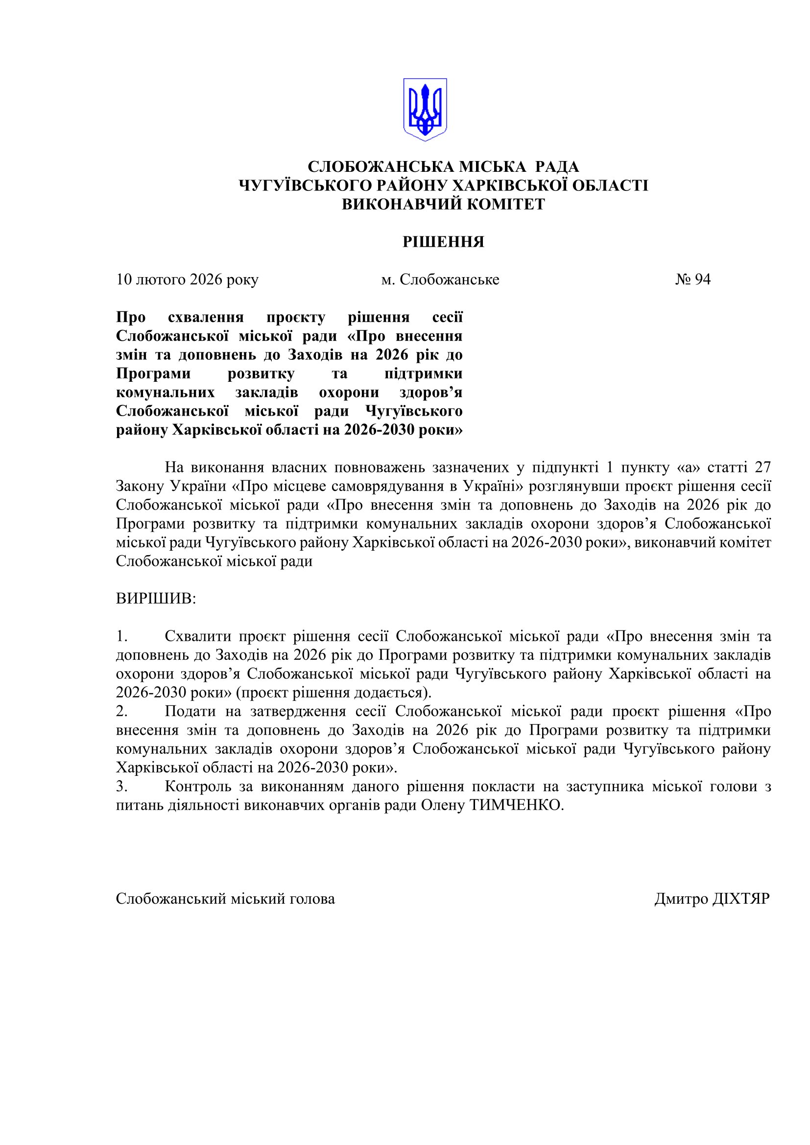 Рішення виконавчого комітету №94 Про схвалення проєкту рішення сесії Слобожанської міської ради «Про внесення змін та доповнень до Заходів на 2026 рік до Програми розвитку та підтримки комунальних закладів охорони здоров’я Слобожанської міської ради Чугуївського району Харківської області на 2026-2030 роки».