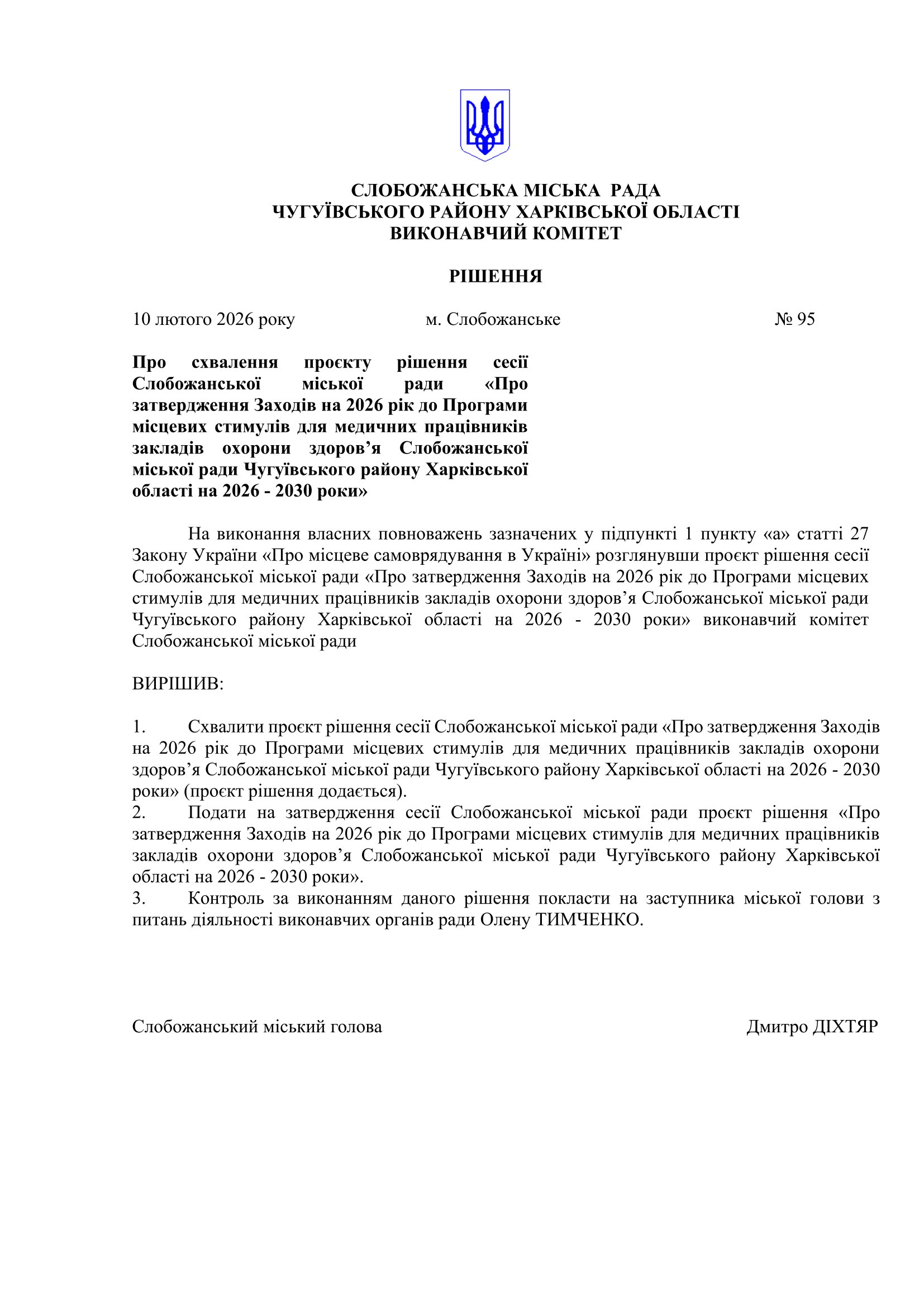 Рішення виконавчого комітету №95 Про схвалення проєкту рішення сесії Слобожанської міської ради «Про затвердження Заходів на 2026 рік до Програми місцевих стимулів для медичних працівників закладів охорони здоров’я Слобожанської міської ради Чугуївського району Харківської області на 2026 - 2030 роки».