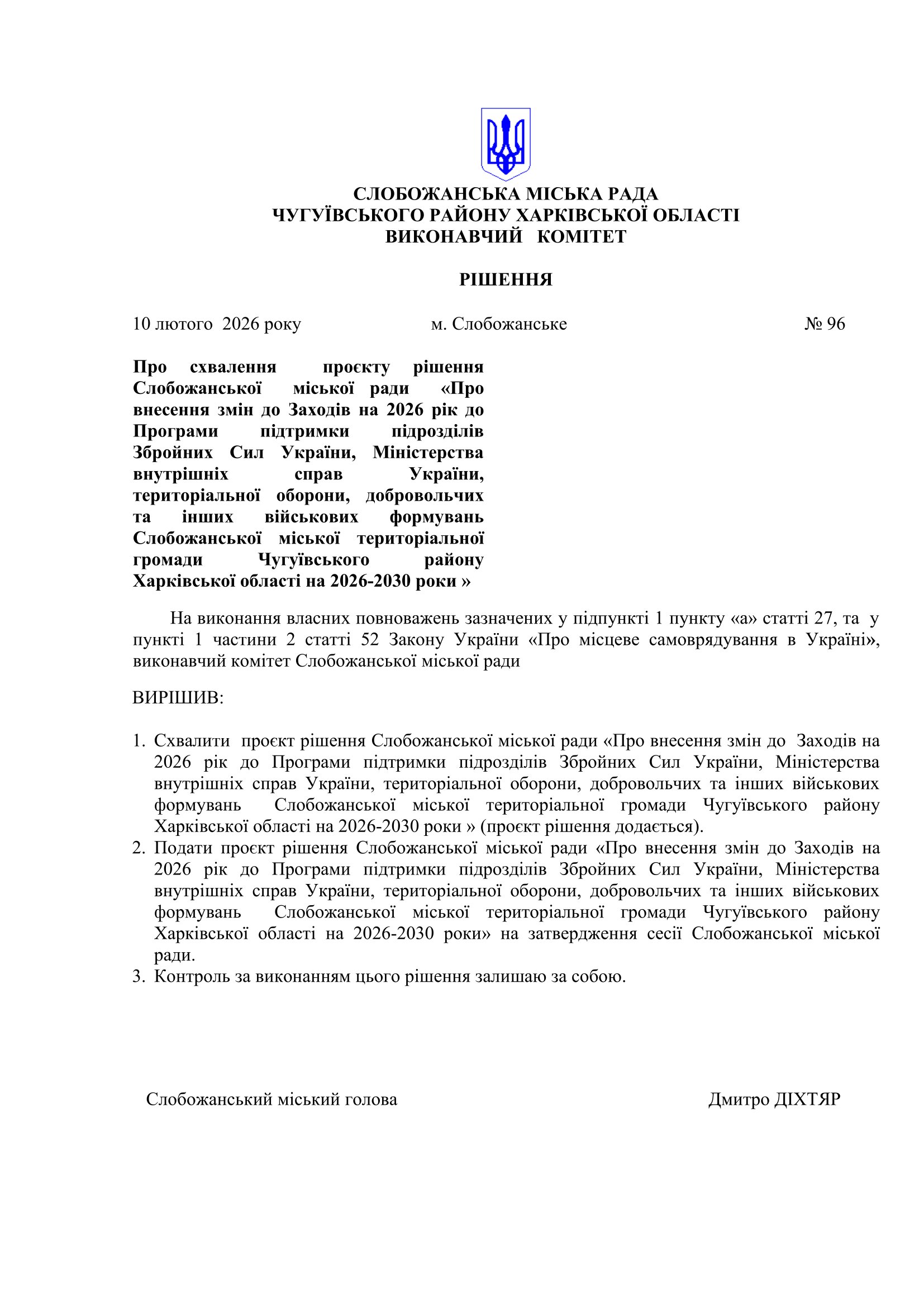 Рішення виконавчого комітету №96 Про схвалення проєкту рішення Слобожанської міської ради «Про внесення змін до Заходів на 2026 рік до Програми підтримки підрозділів Збройних Сил України, Міністерства внутрішніх справ України, територіальної оборони, добровольчих та інших військових формувань Слобожанської міської територіальної громади Чугуївського району Харківської області на 2026-2030 роки».
