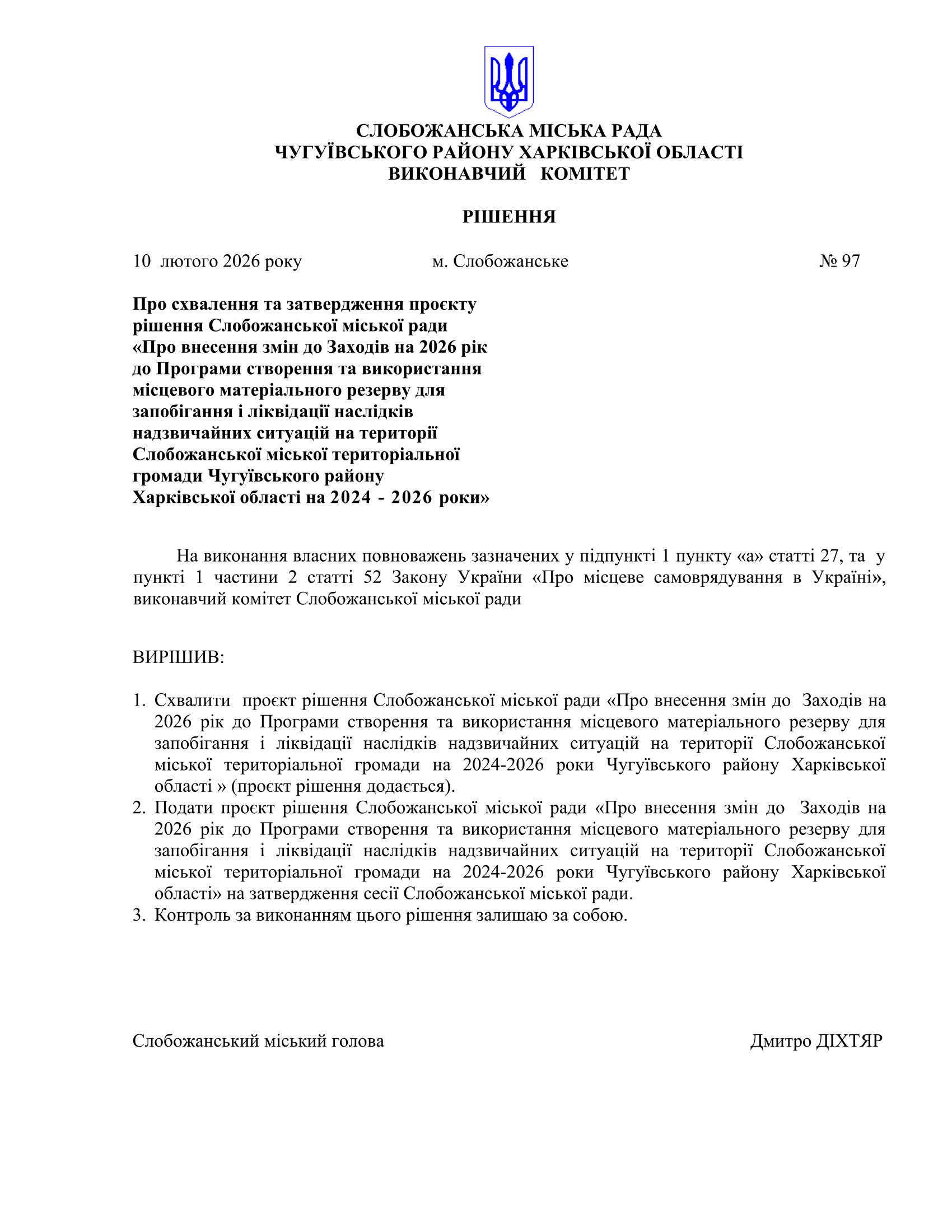 Рішення виконавчого комітету №97 Про схвалення та затвердження проєкту рішення Слобожанської міської ради «Про внесення змін до Заходів на 2026 рік до Програми створення та використання місцевого матеріального резерву для запобігання і ліквідації наслідків надзвичайних ситуацій на території Слобожанської міської територіальної громади Чугуївського району Харківської області на 2024 - 2026 роки».