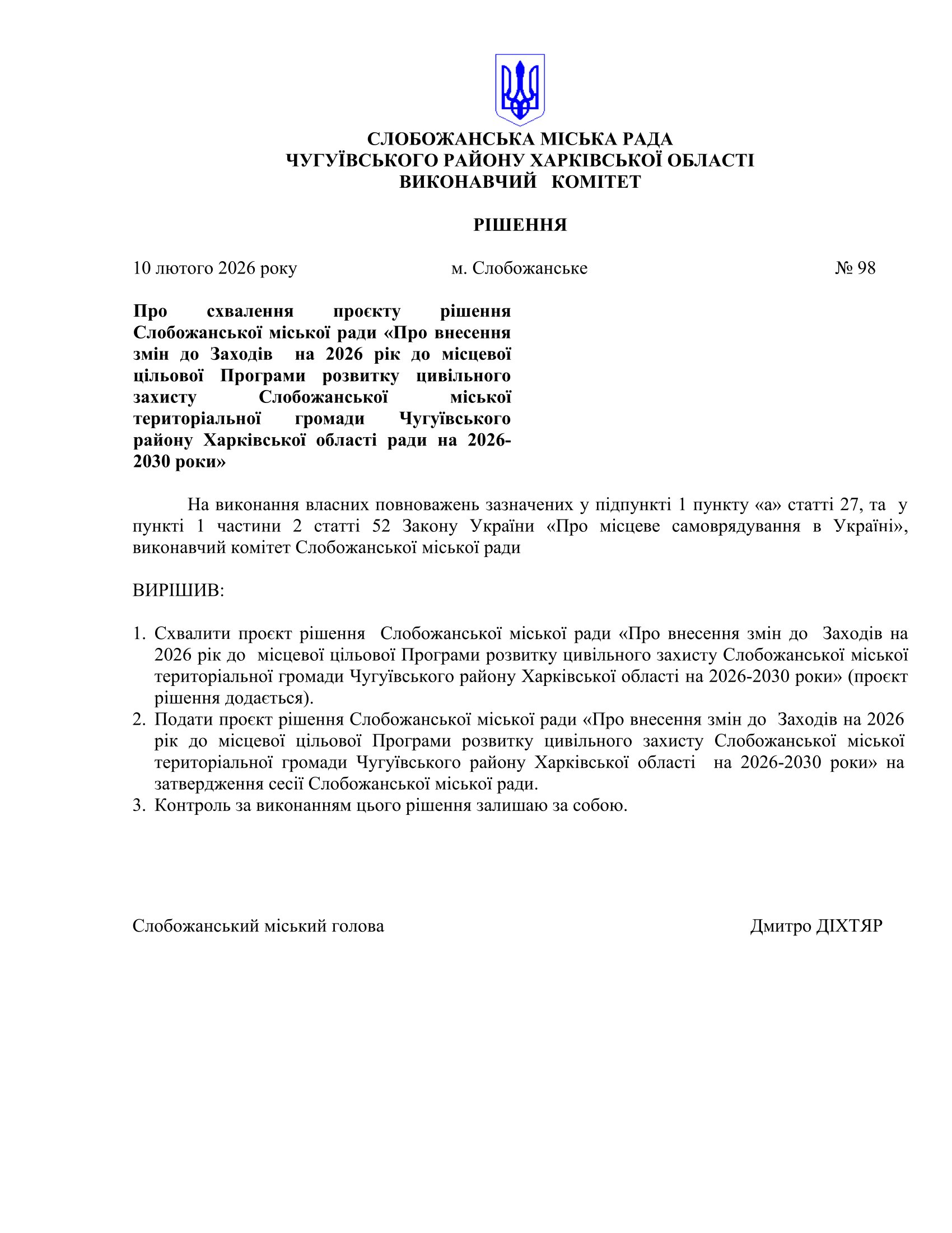 Рішення виконавчого комітету №98 Про схвалення проєкту рішення Слобожанської міської ради «Про внесення змін до Заходів на 2026 рік до місцевої цільової Програми розвитку цивільного захисту Слобожанської міської територіальної громади Чугуївського району Харківської області ради на 2026-2030 роки».