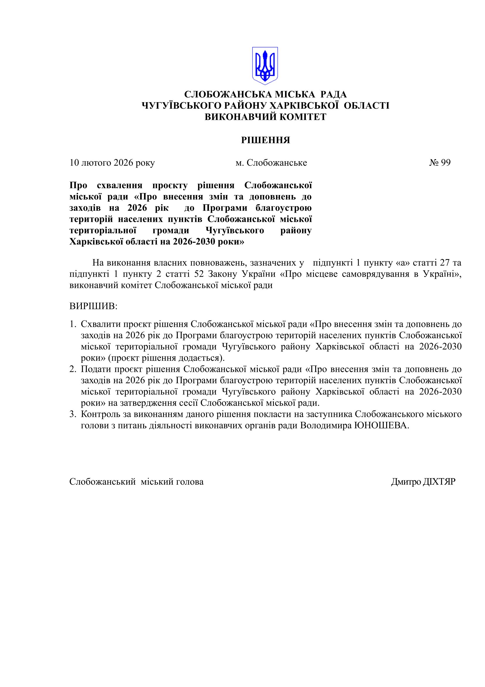 Рішення виконавчого комітету №99 Про схвалення проєкту рішення Слобожанської міської ради «Про внесення змін та доповнень до заходів на 2026 рік до Програми благоустрою територій населених пунктів Слобожанської міської територіальної громади Чугуївського району Харківської області на 2026-2030 роки».