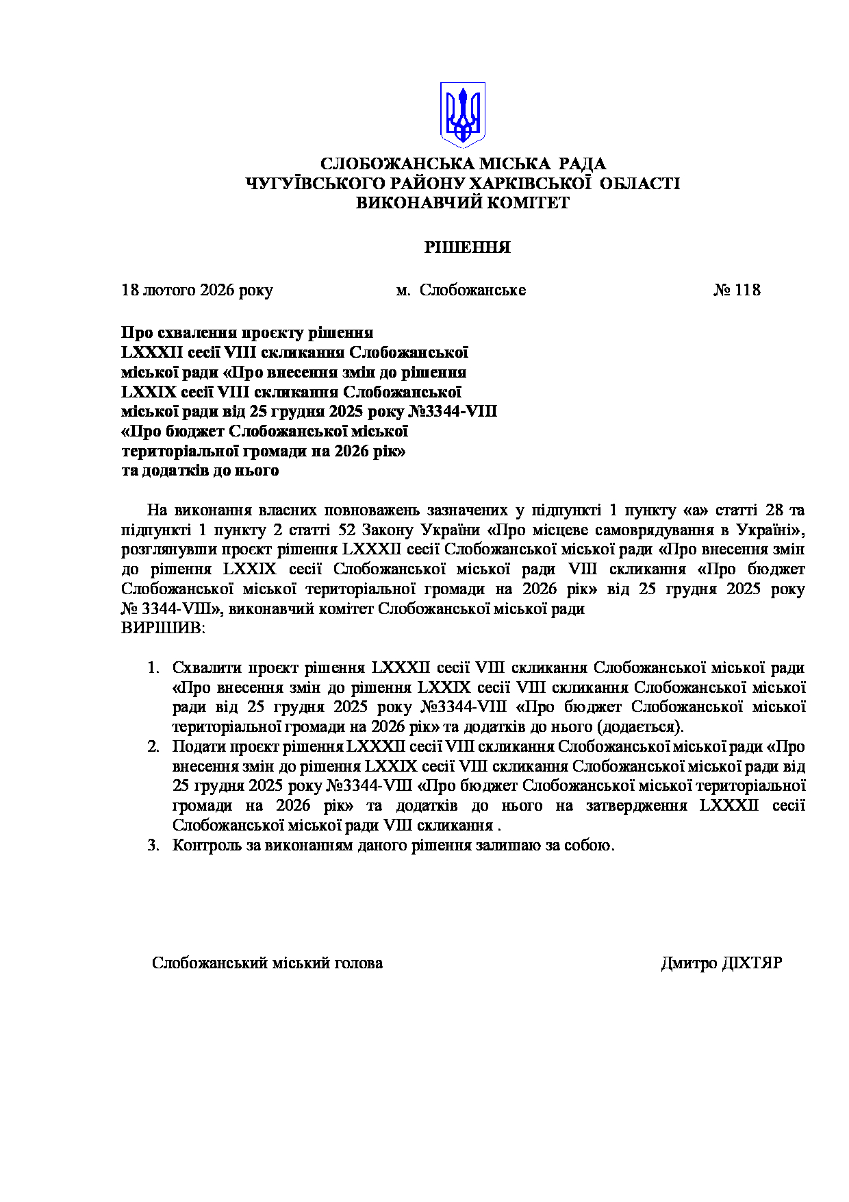 Рішення виконавчого комітету №118 Про схвалення проєкту рішення LXХXІІ сесії VIII скликання Слобожанської міської ради «Про внесення змін до рішення LXXIX сесії VIII скликання Слобожанської міської ради від 25 грудня 2025 року №3344-VIII «Про бюджет Слобожанської міської територіальної громади на 2026 рік» та додатків до нього.