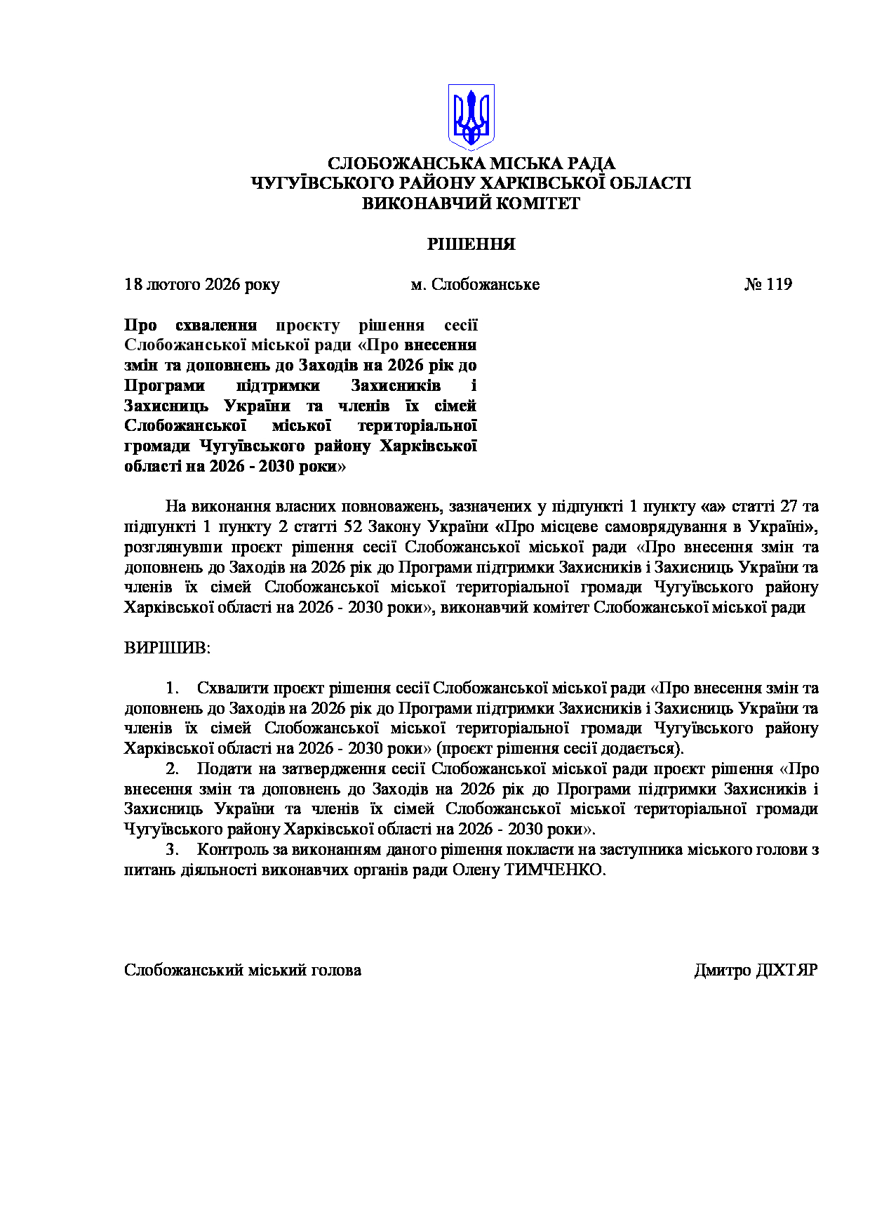 Рішення виконавчого комітету №119 Про схвалення проєкту рішення сесії Слобожанської міської ради «Про внесення змін та доповнень до Заходів на 2026 рік до Програми підтримки Захисників і Захисниць України та членів їх сімей Слобожанської міської територіальної громади Чугуївського району Харківської області на 2026 - 2030 роки».