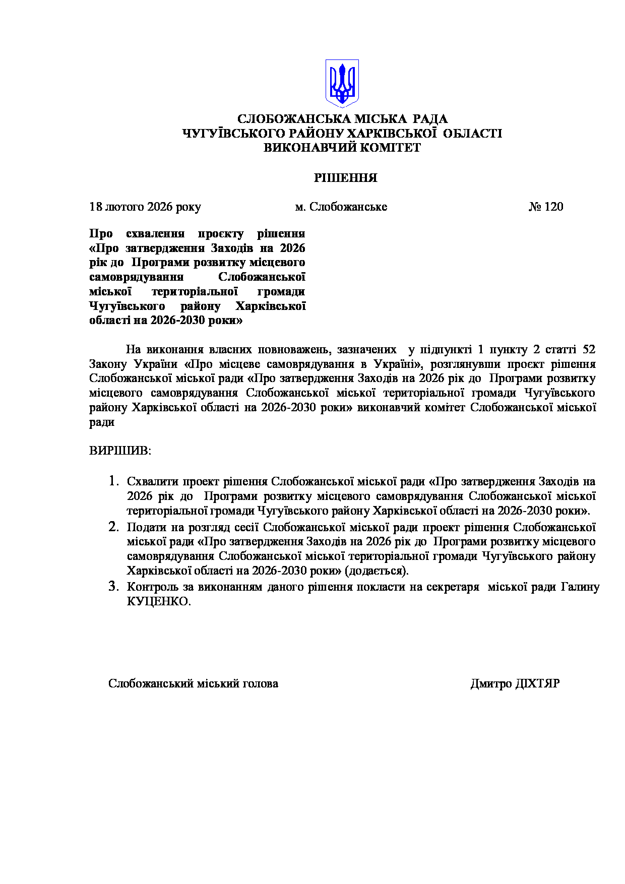 Рішення виконавчого комітету №120 Про схвалення проєкту рішення «Про затвердження Заходів на 2026 рік до Програми розвитку місцевого самоврядування Слобожанської міської територіальної громади Чугуївського району Харківської області на 2026-2030 роки».