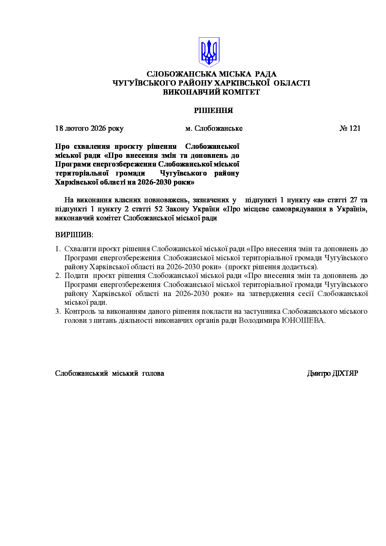 Рішення виконавчого комітету №121 Про схвалення проєкту рішення Слобожанської міської ради «Про внесення змін та доповнень до Програми енергозбереження Слобожанської міської територіальної громади Чугуївського району Харківської області на 2026-2030 роки».