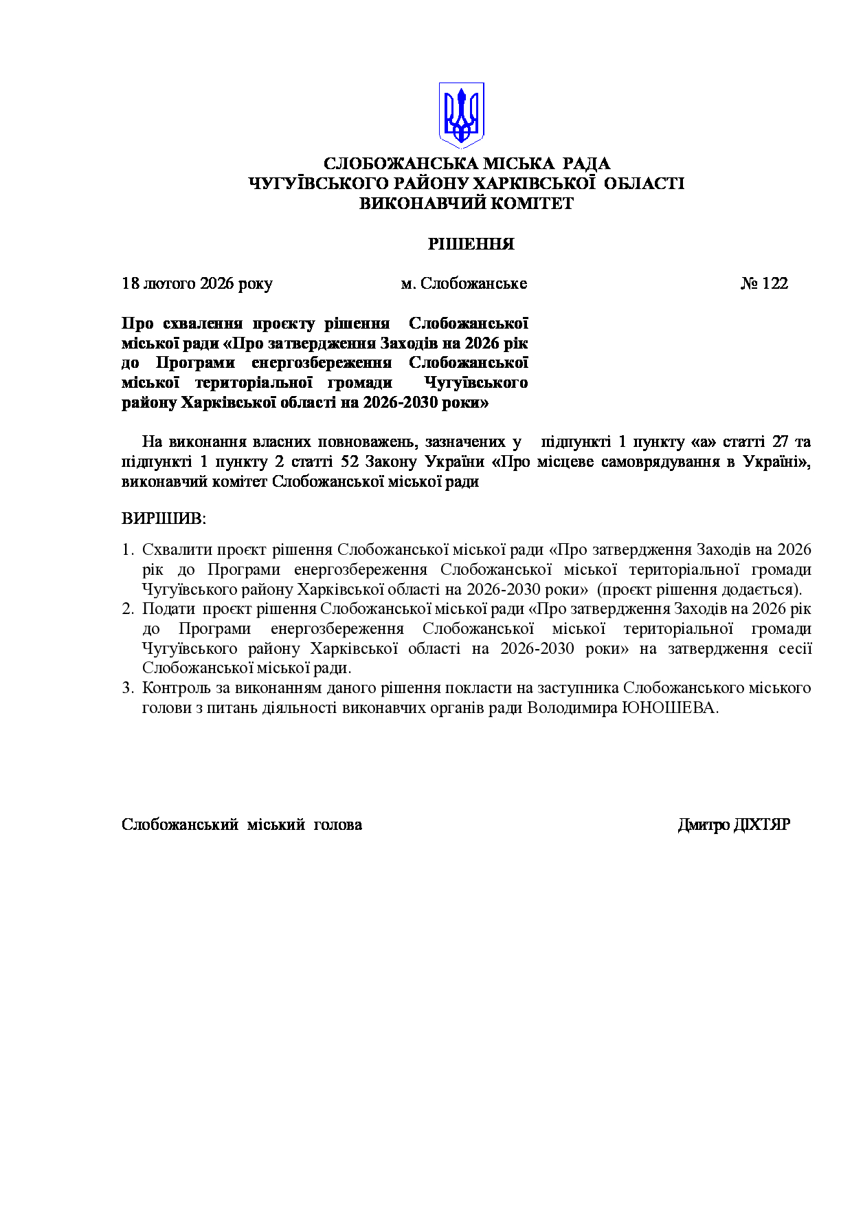 Рішення виконавчого комітету №122 Про схвалення проєкту рішення Слобожанської міської ради «Про затвердження Заходів на 2026 рік до Програми енергозбереження Слобожанської міської територіальної громади Чугуївського району Харківської області на 2026-2030 роки».