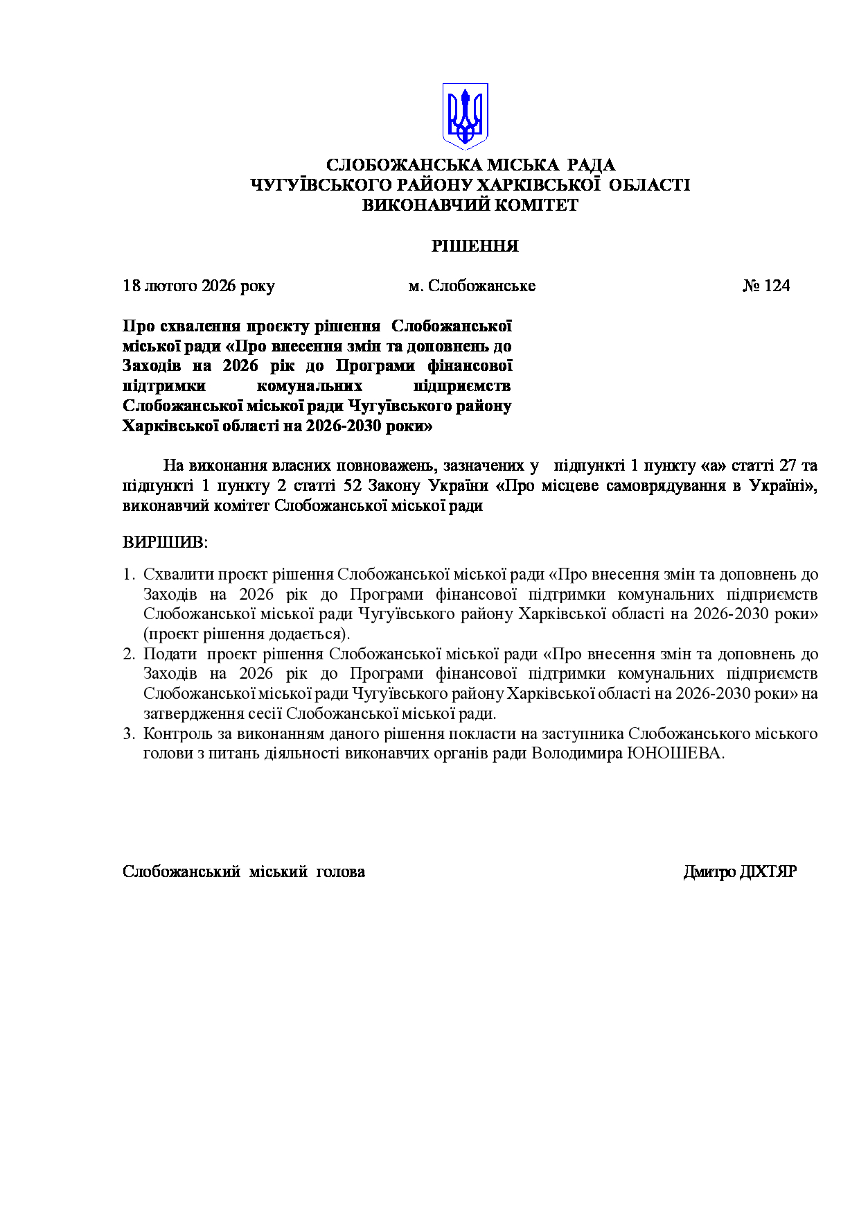 Рішення виконавчого комітету №124 Про схвалення проєкту рішення Слобожанської міської ради «Про внесення змін та доповнень до Заходів на 2026 рік до Програми фінансової підтримки комунальних підприємств Слобожанської міської ради Чугуївського району Харківської області на 2026-2030 роки».
