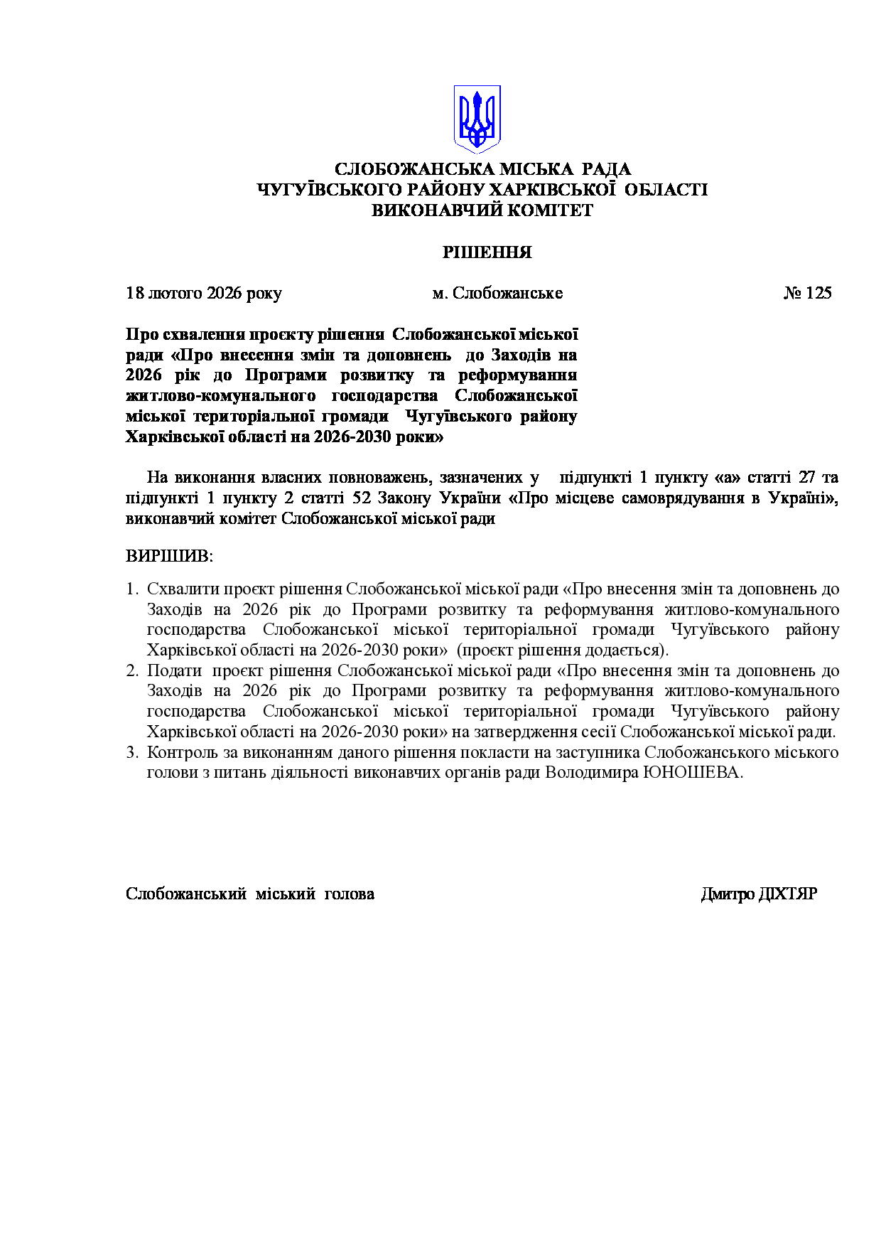 Рішення виконавчого комітету №125 Про схвалення проєкту рішення Слобожанської міської ради «Про внесення змін та доповнень до Заходів на 2026 рік до Програми розвитку та реформування житлово-комунального господарства Слобожанської міської територіальної громади Чугуївського району Харківської області на 2026-2030 роки».