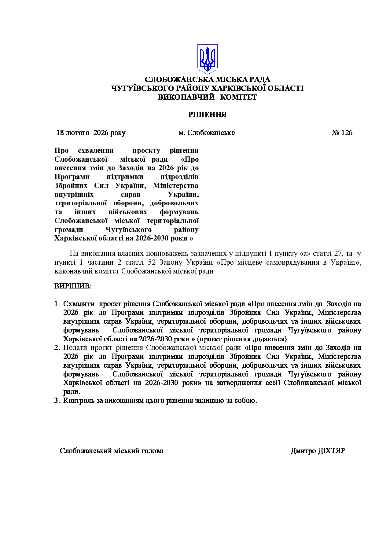Рішення виконавчого комітету №126 Про схвалення проєкту рішення Слобожанської міської ради «Про внесення змін до Заходів на 2026 рік до Програми підтримки підрозділів Збройних Сил України, Міністерства внутрішніх справ України, територіальної оборони, добровольчих та інших військових формувань Слобожанської міської територіальної громади Чугуївського району Харківської області на 2026-2030 роки ».