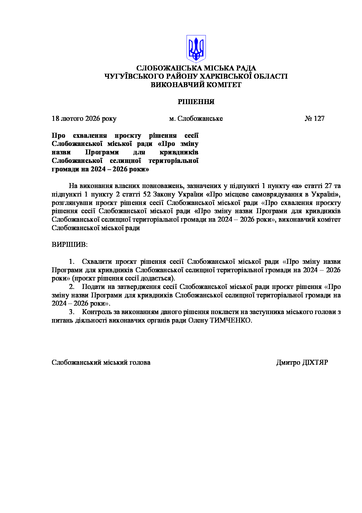 Рішення виконавчого комітету №127 Про схвалення проєкту рішення сесії Слобожанської міської ради «Про зміну назви Програми для кривдників Слобожанської селищної територіальної громади на 2024 – 2026 роки».