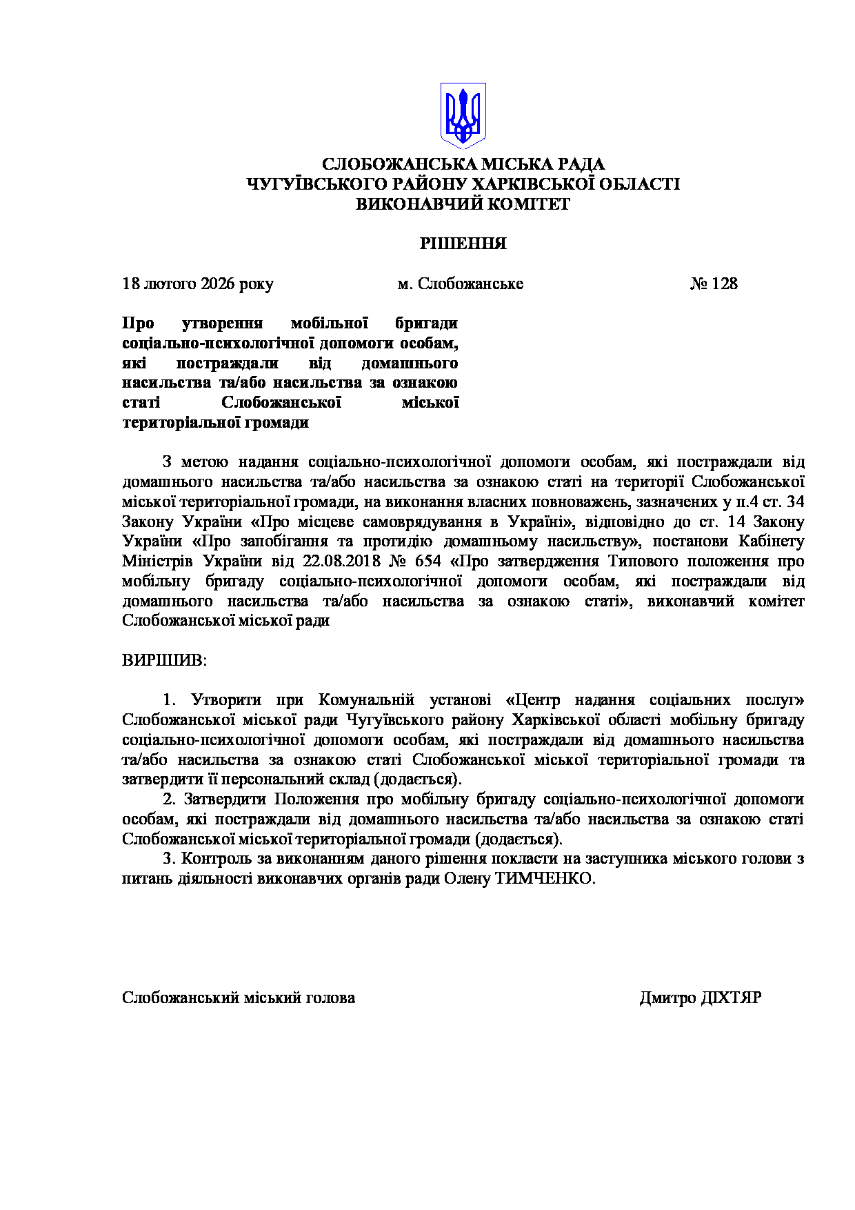 Рішення виконавчого комітету №128 Про утворення мобільної бригади соціально-психологічної допомоги особам, які постраждали від домашнього насильства та/або насильства за ознакою статі Слобожанської міської територіальної громади.