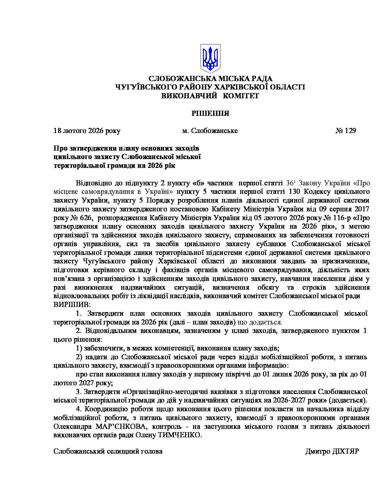 Рішення виконавчого комітету №129 Про затвердження плану основних заходів цивільного захисту Слобожанської міської територіальної громади на 2026 рік.