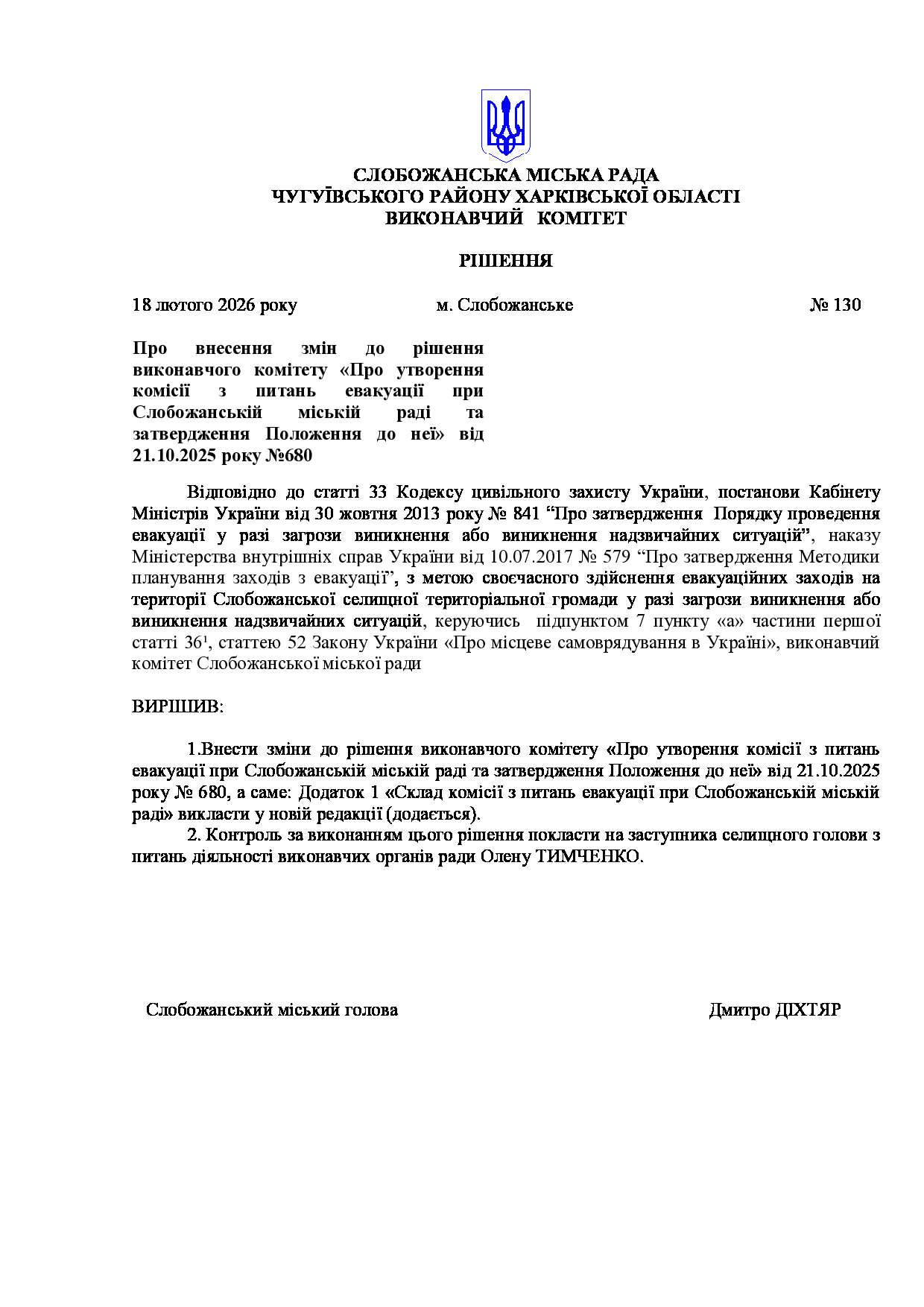 Рішення виконавчого комітету №130 Про внесення змін до рішення виконавчого комітету «Про утворення комісії з питань евакуації при Слобожанській міській раді та затвердження Положення до неї» від 21.10.2025 року №680 .